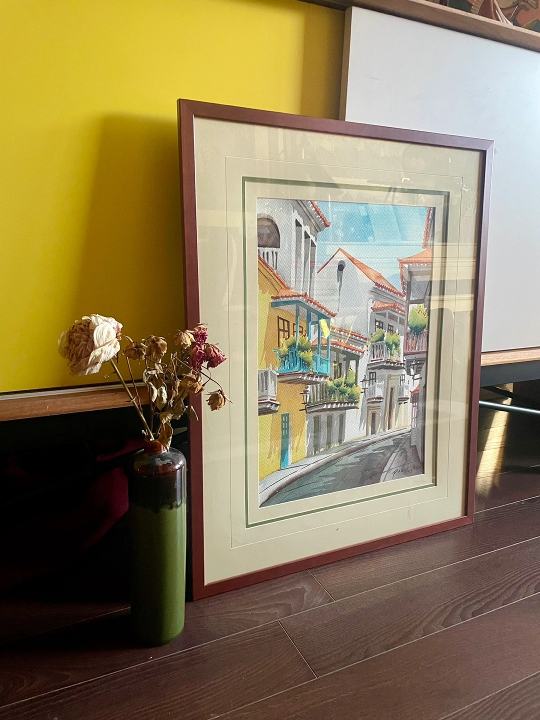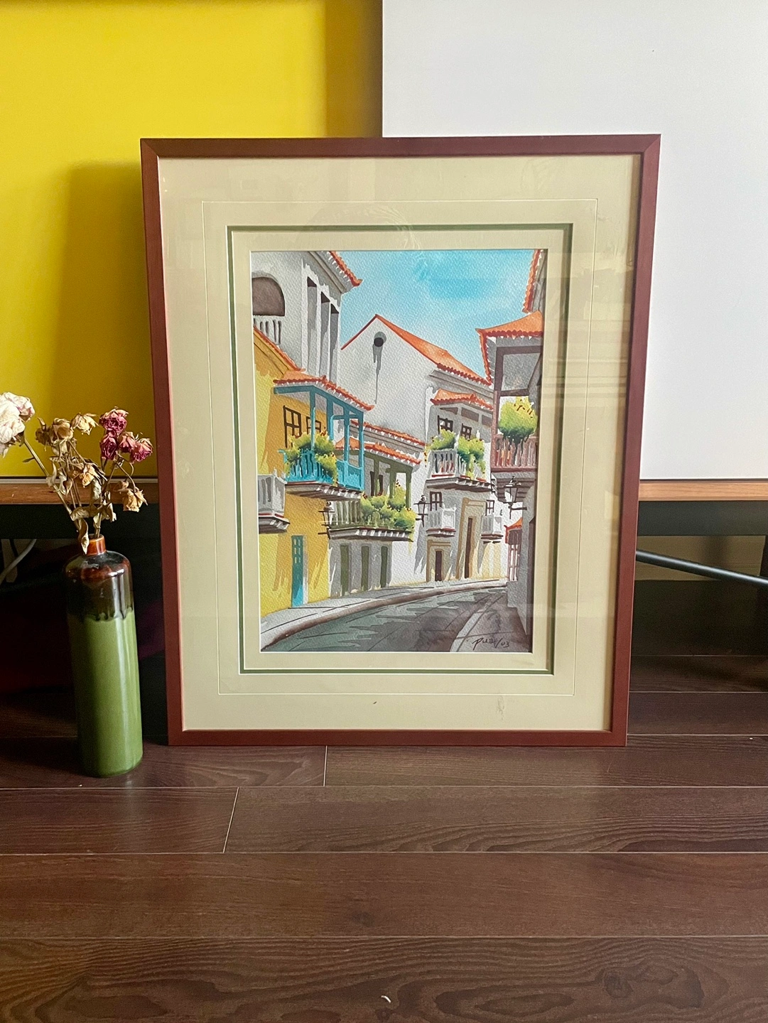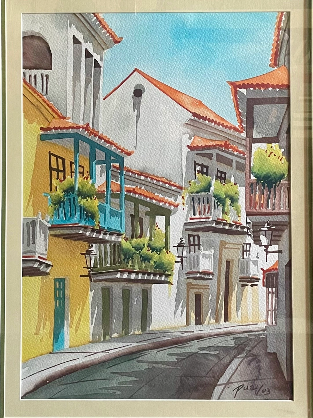 Watercolour composition on paper, signed and dated lower right, depicting a vibrant, sunlit street scene, likely from a Colombian town, featuring narrow, winding streets with colorful colonial-style buildings. The balconies are adorned with lush green plants. Quaint and beautiful! 28 1/2” x 22 1/2” Pick up around Sherbourne/ Wellesley Could ship/ deliver for a fee
