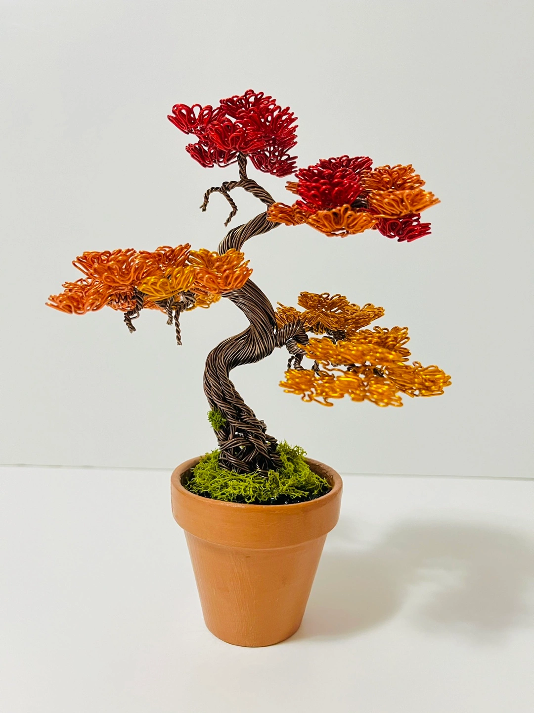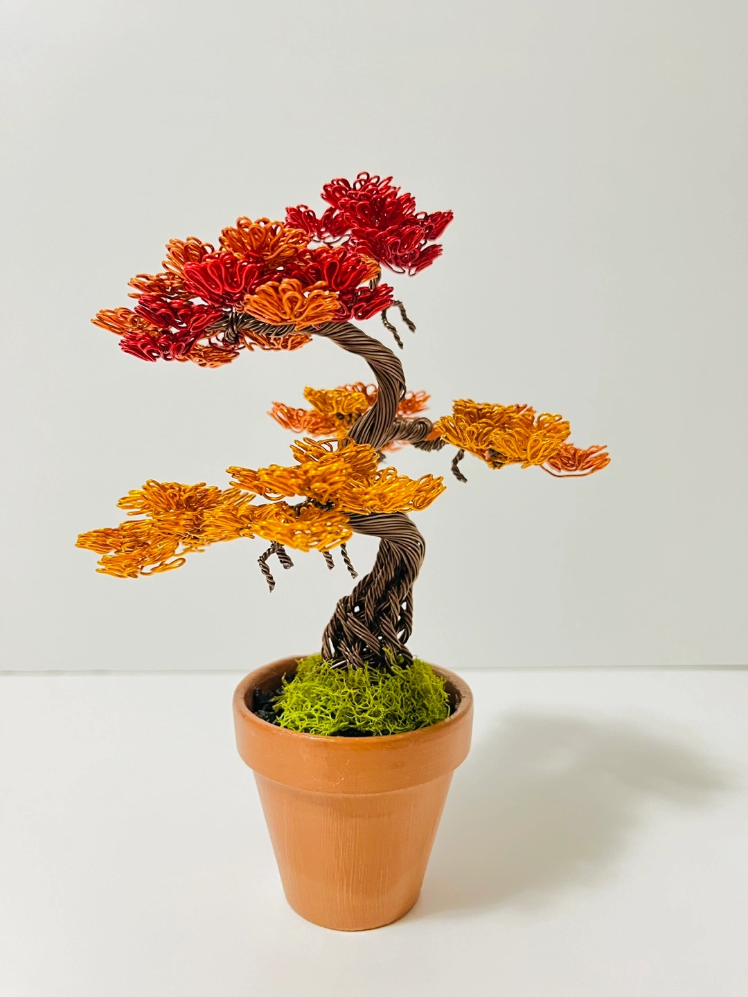 It was completely handmade by me and my wife, a unique piece crafted by us, Whether as a decoration in an apartment or office, whether in a showcase, on the shelf, on the desk or a side table, and also perfectly for birthday gifts, anniversary who loves bonsai, and flowers, it will always be an eye-catcher. Timeless, simple and yet special. A unique piece of art for your home. The tree is made of aluminum wires that sits on a ceramic pot with green moss, The trunk and branches are all intricately woven together. The tree is accented with red, orange and yellow leaves that give it a realistic look.