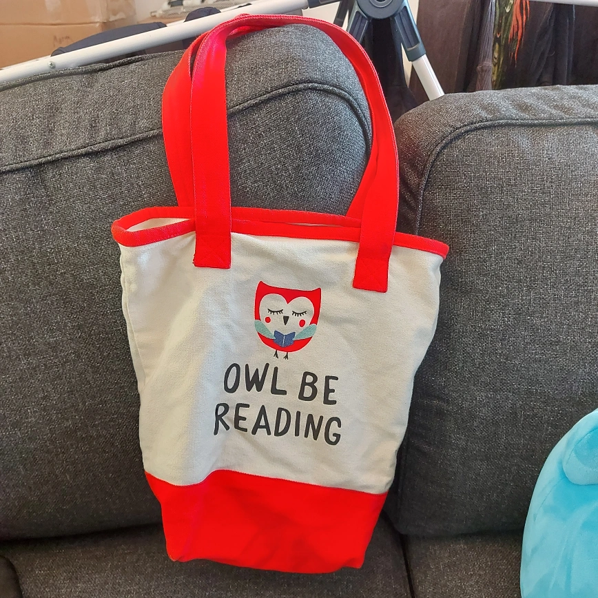Used canvas tote bag with red handles and bottom. Features an owl reading a book with the text "Owl Be Reading". Big enough to carry a a couple of books or a lunch. Exact amount in cash please. Pick up at Pape Station.