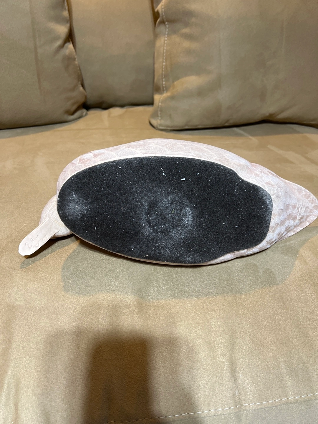 Hand-carved wooden duck decoy. Detailed carving of feathers. Signed on the bottom. Measures approximately 12 inches in length.