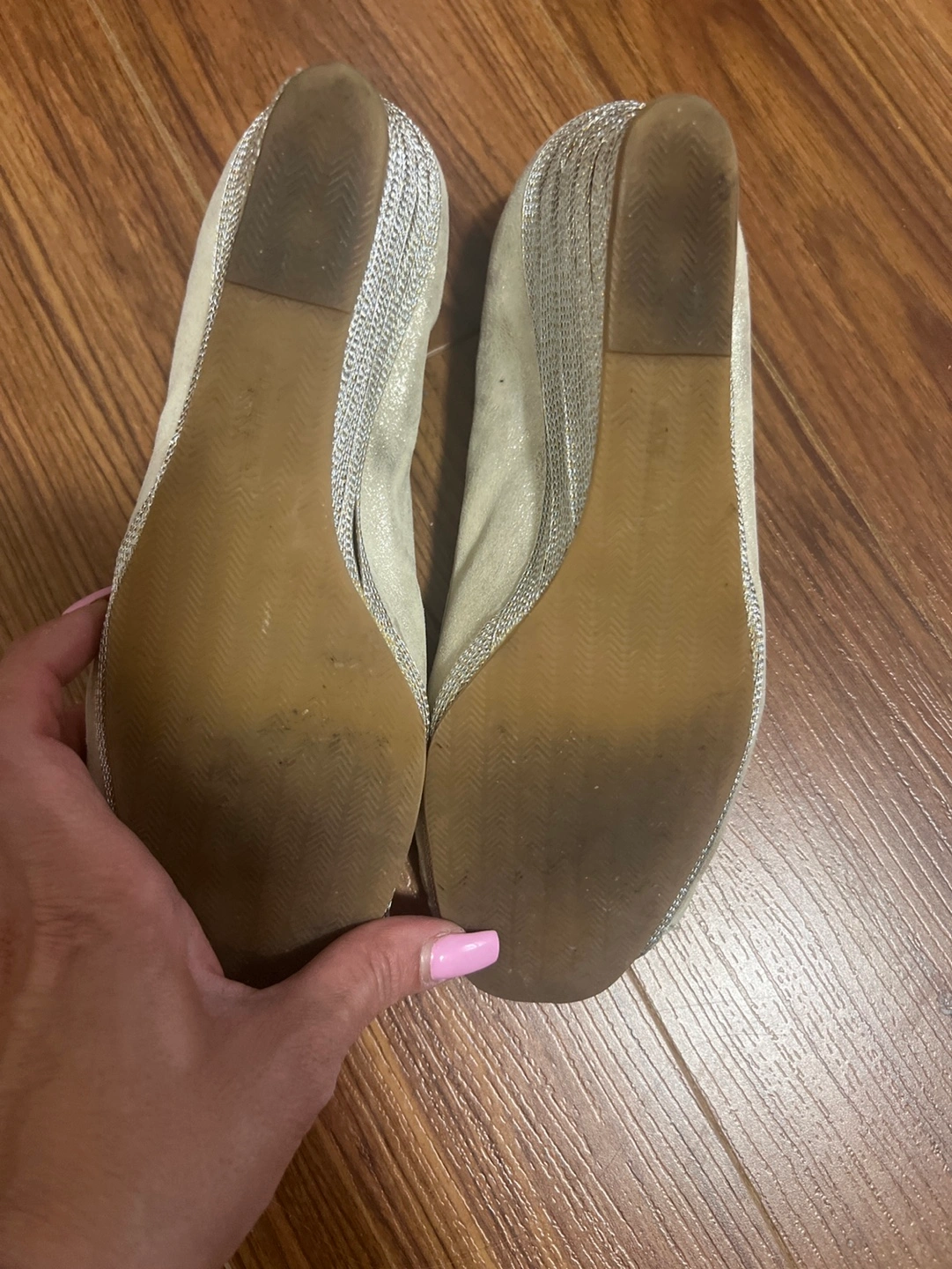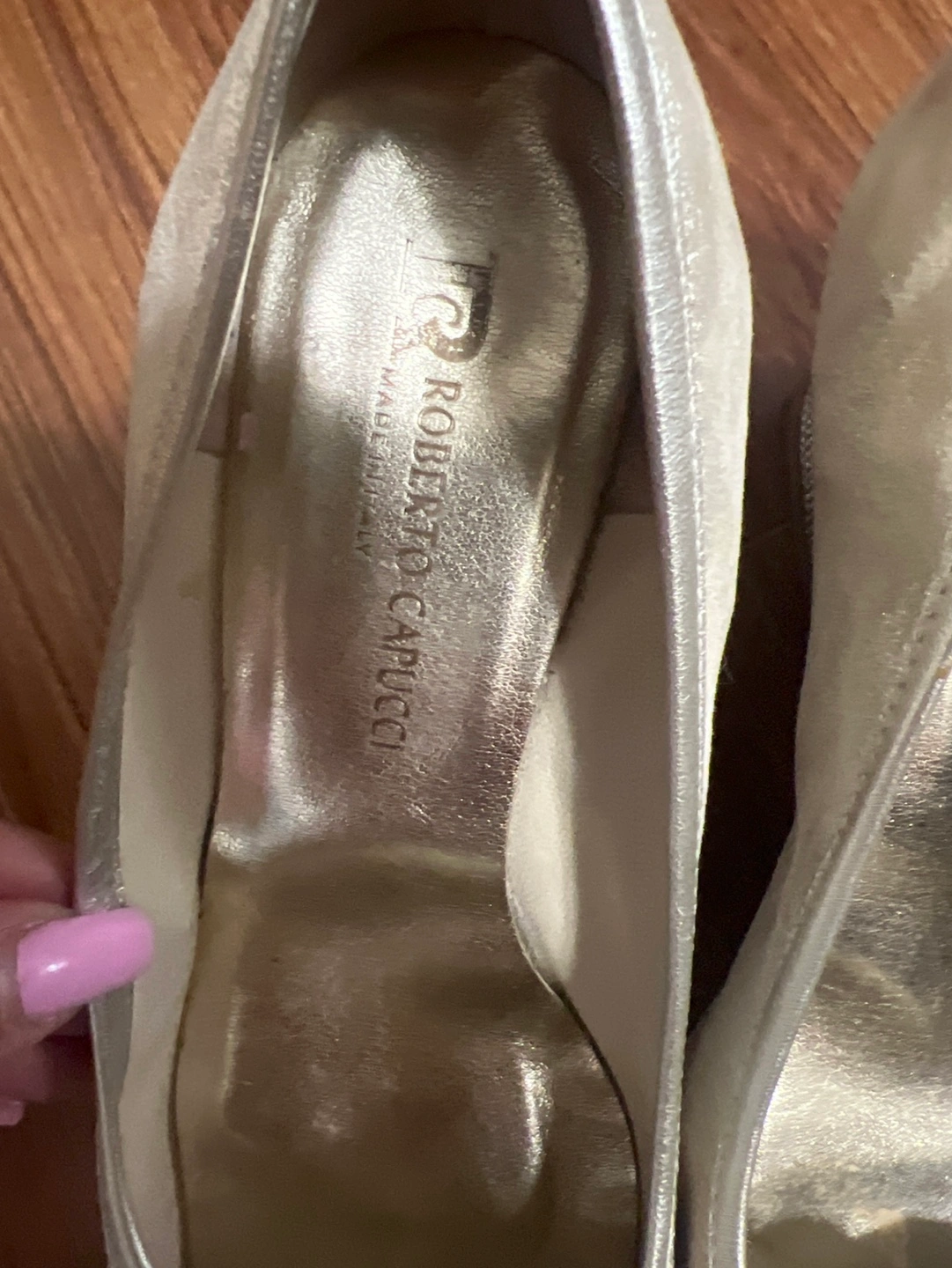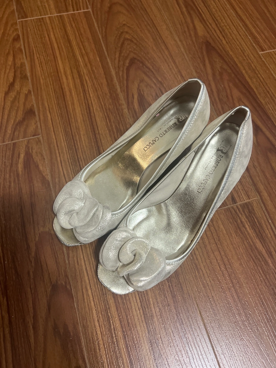 96Gold wedge heels with a flower detail on the front. Made in Italy. Size 37
