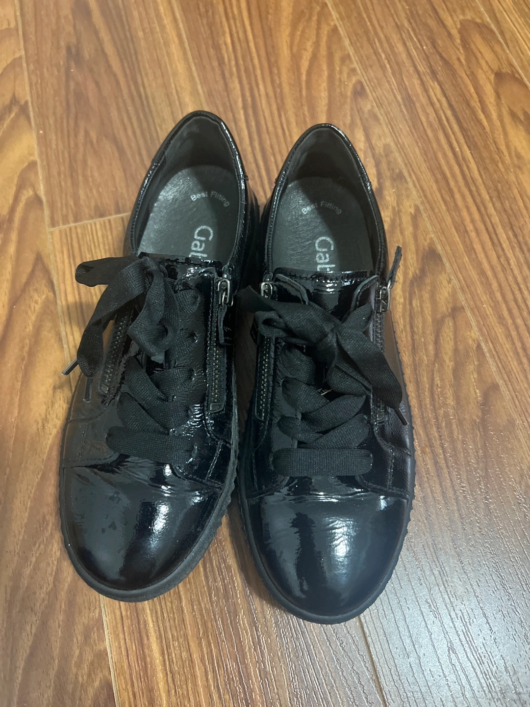 96Black patent leather sneakers with black laces and a zipper. Size 7 Good condition.