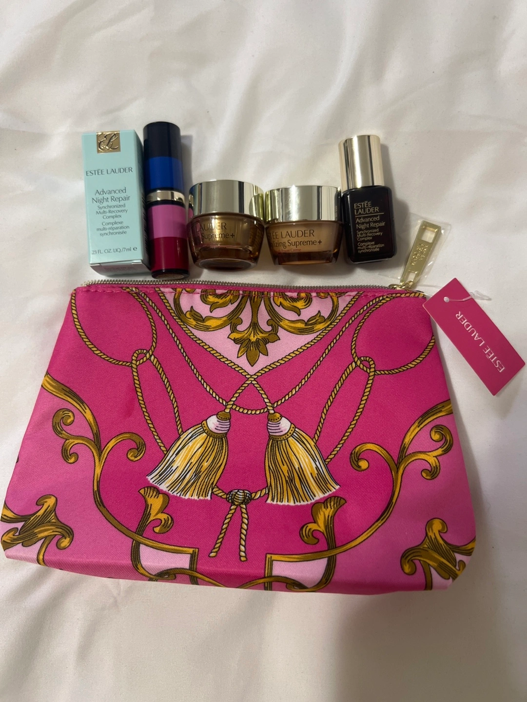 96Set of Estee Lauder skincare products in a pink pouch. Includes Advanced Night Repair Synchronized Multi-Recovery Complex, Advanced Night Repair Synchronized Recovery Complex, Revitalizing Supreme+ and Advanced Supreme+.