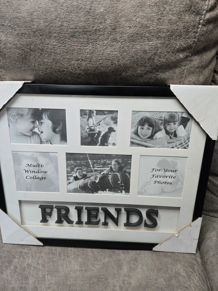 Black picture frame with white mat. Holds six pictures. Features the word "FRIENDS" in raised, black lettering. Never used