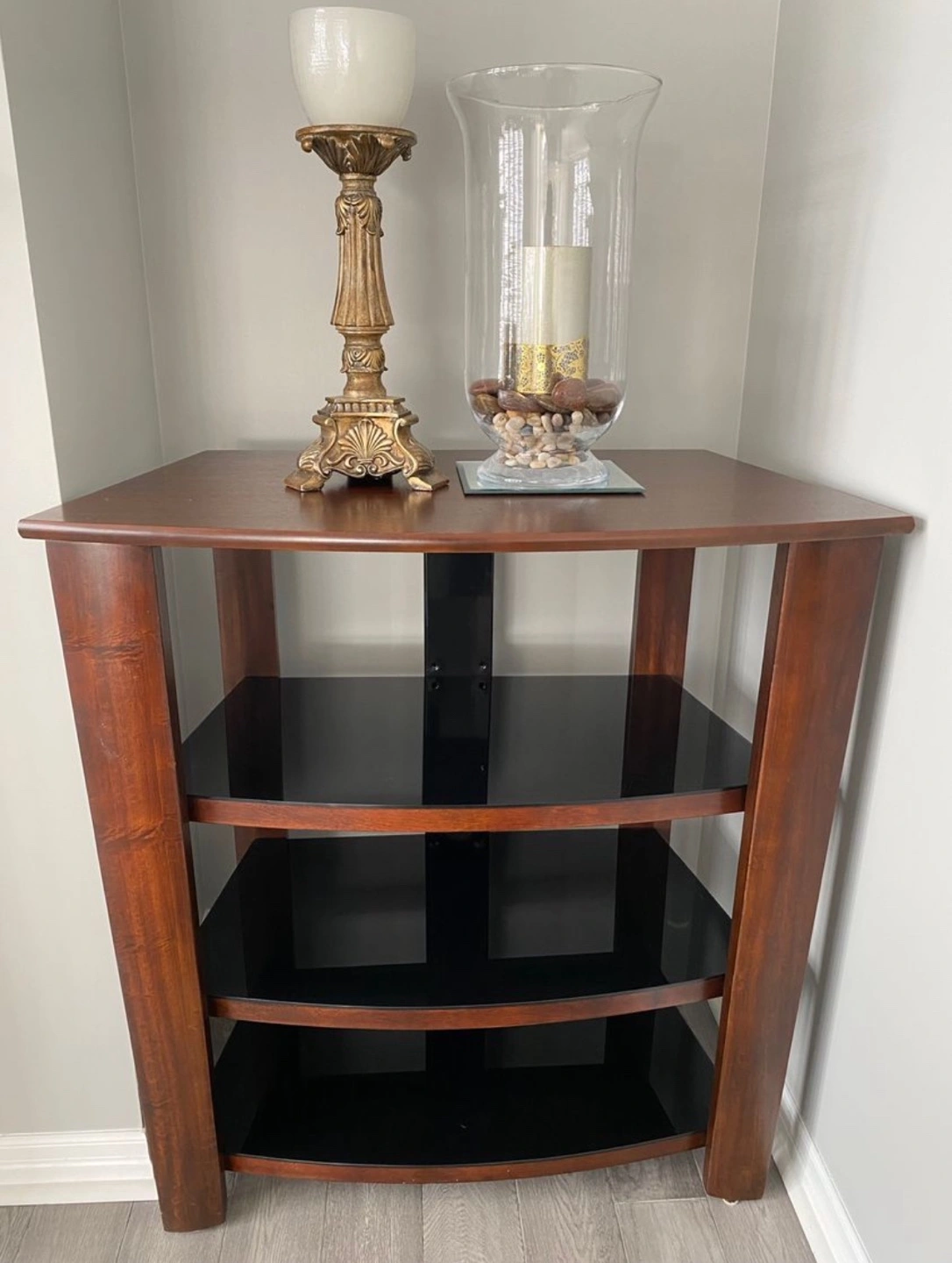 Wooden Shelving with three glass shelves. Good condition. Very Sturdy and solid.