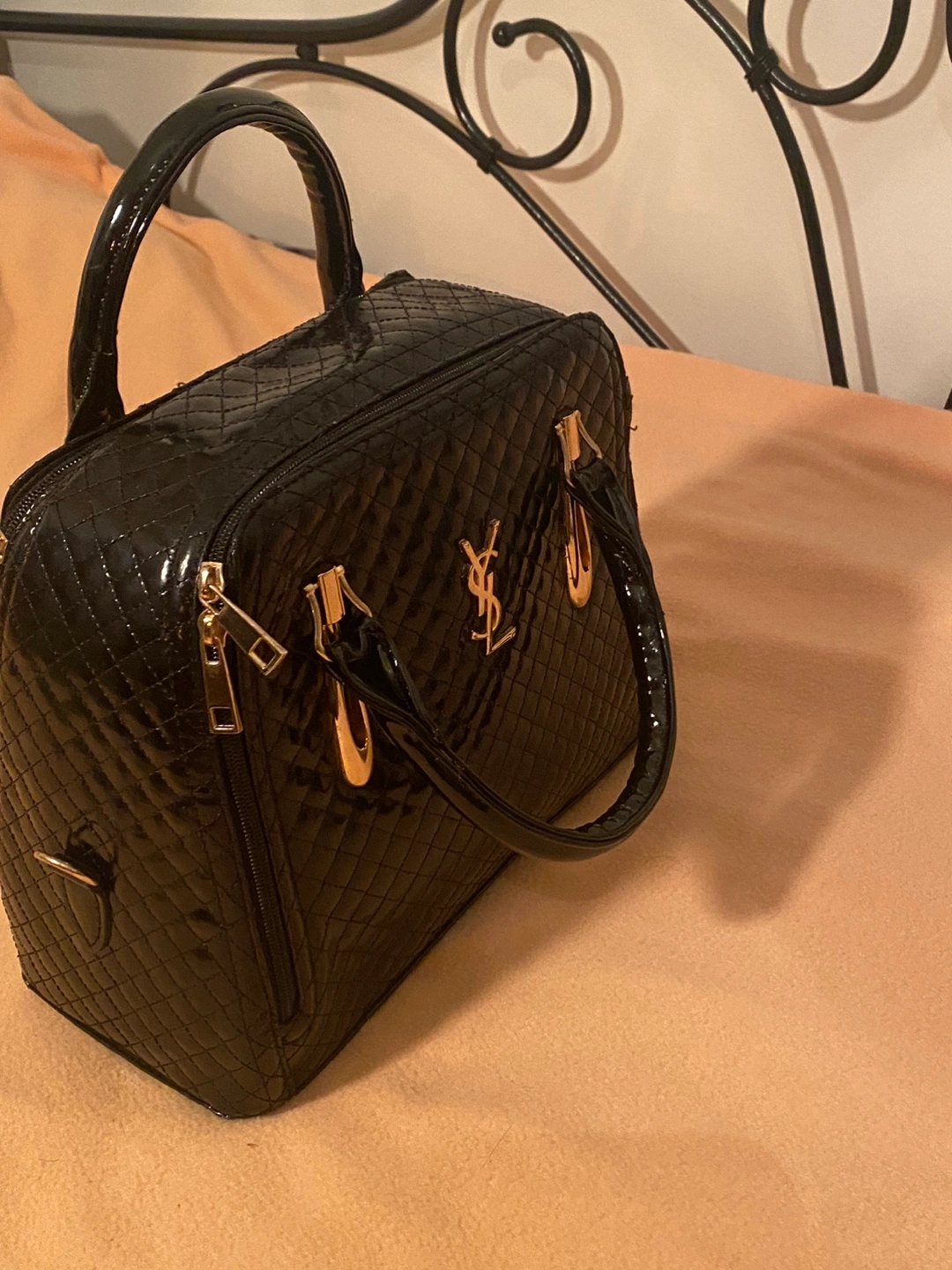 164Black quilted handbag with gold hardware and accents. Two zippered compartments, one interior pocket.