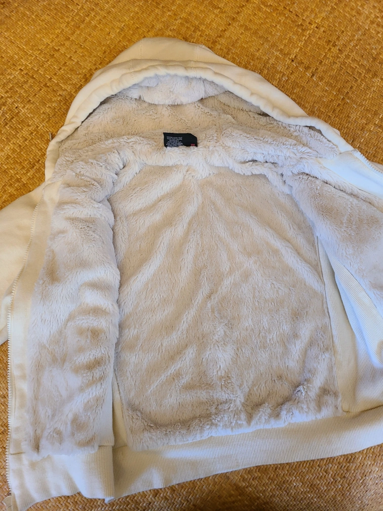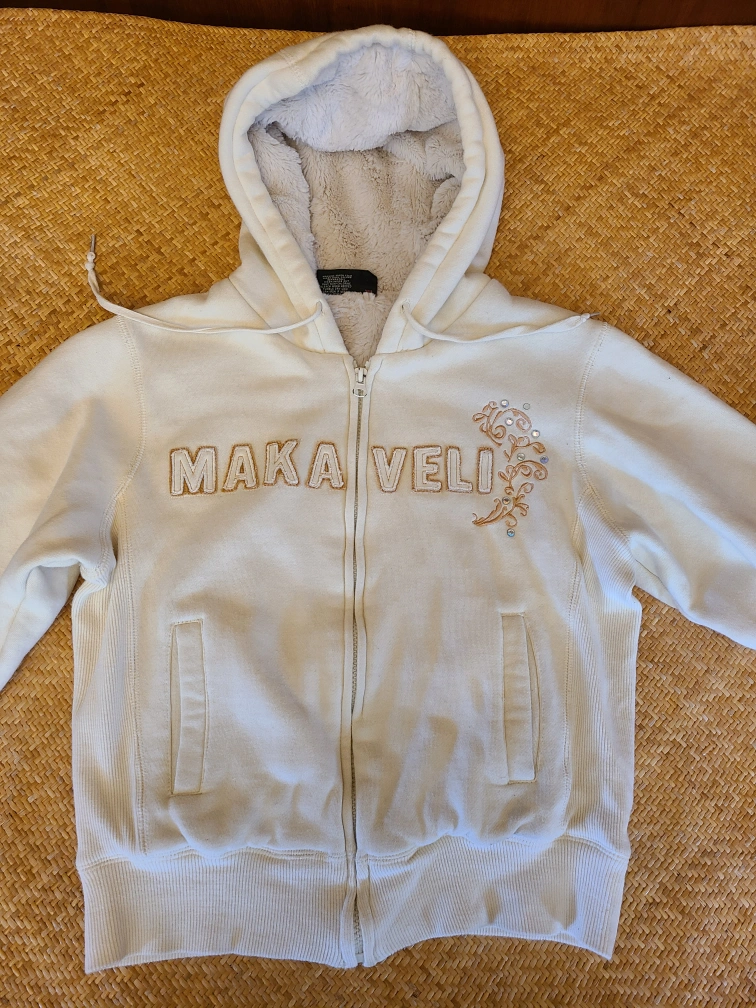 White hoodie with embroidered branding. Zip up front, two front pockets.