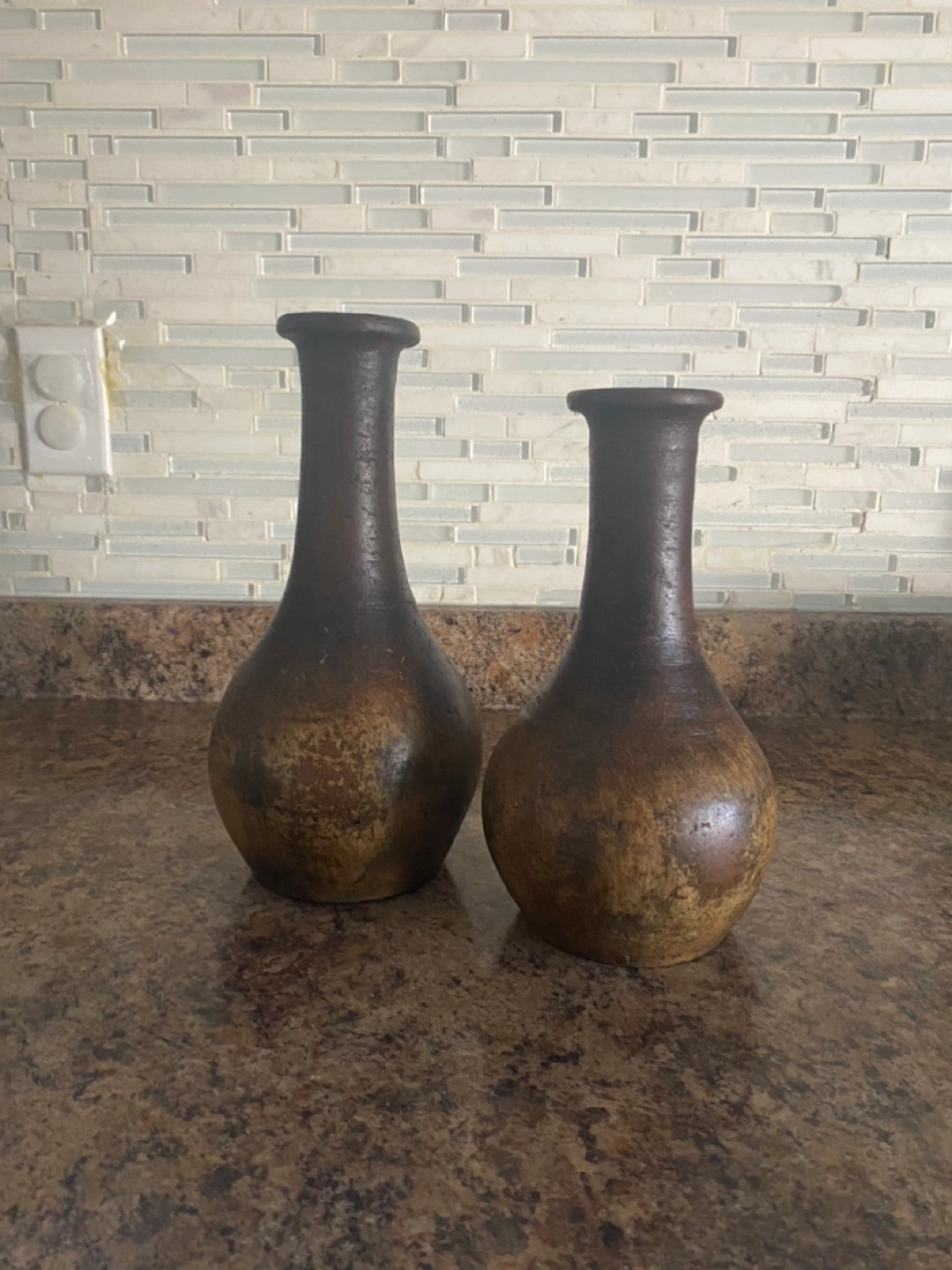 Two brown ceramic vases. One is larger than the other. Both have a bulbous base and a thin neck.one is 11 in high the other is 9 1/2 in high.