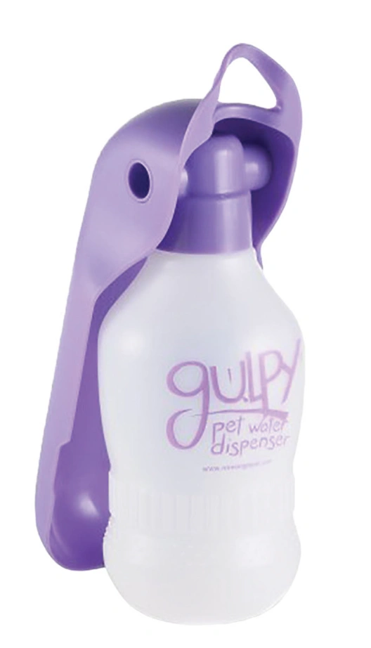 Purple pet water dispenser. Great for walks, hikes, car rides and on the go. Has a carrying handle and clip. It flips open easily to squeeze just the right amount of water your cat ,dog,or small pet needs. Very compact and easy to store.