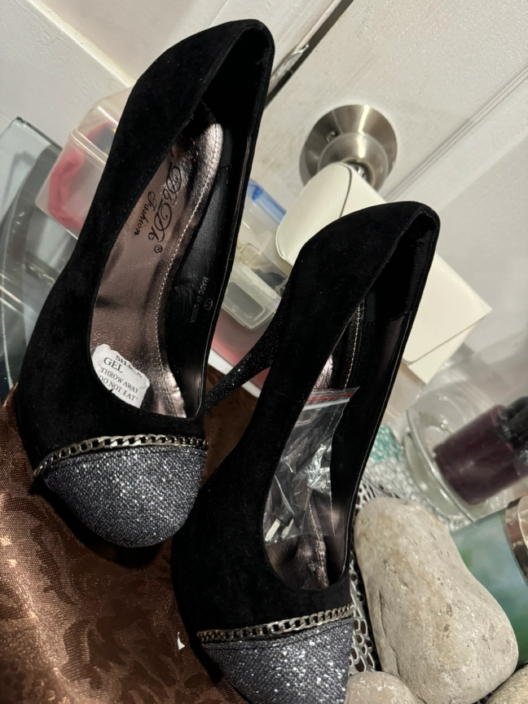 Black suede high heels with silver glitter on the toe and a silver chain around the toe. Heel height is approximately 4 inches. Comes with extra heel tips.