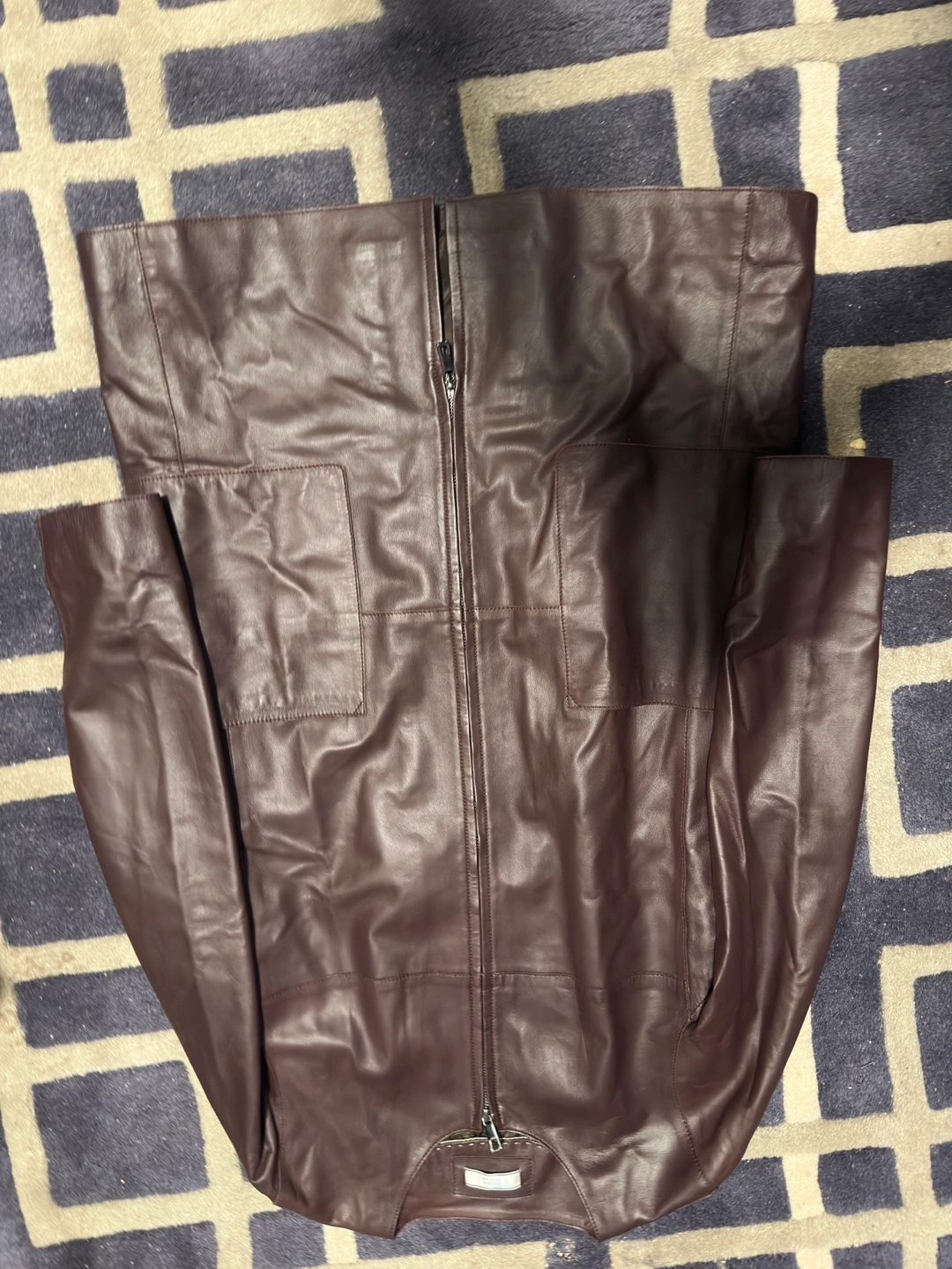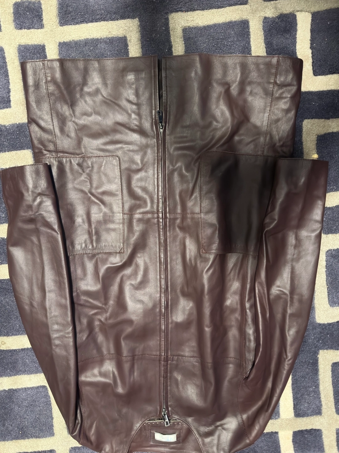 Brown leather jacket with long sleeves and a zipper closure. Has two pockets on the front.