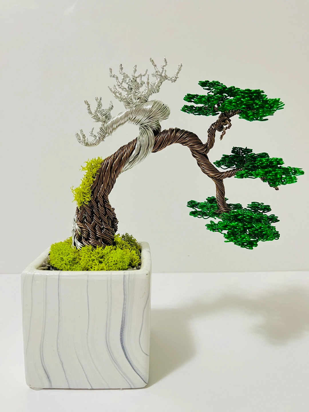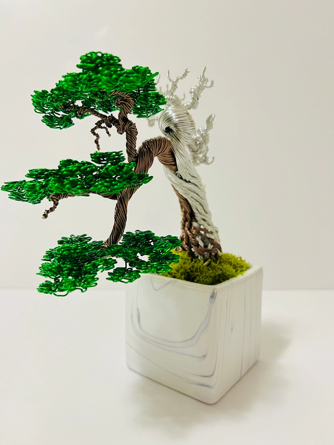 Pick up at 1840 Victoria park avenue toronto, cash only Size:(Dimensions) Hieght: 8.5 inches Width: 7 inches Depth: 3 inches CASCADING BONSAI TREE WITH WHITE TREE The bonsai has been made with ALUMINUM WIRES It was completely handmade by me and my wife, a unique piece crafted by us, Whether as a decoration in an apartment or office, whether in a showcase, on the shelf, on the desk or a side table, and also perfectly for birthday gifts, anniversary who loves bonsai, and flowers, it will always be an eye-catcher. Timeless, simple and yet special. A unique piece of art for your home. The tree has a silver and brown aluminum wire trunk and branches. Green aluminum wire is used to form the leaves. The tree is potted in a white square planter with a moss and marble pattern About us: We are originally from Philippines and migrate in Toronto Canada. We craft wire trees inspired by flowers and Bonsai, Everything we do is by hand and each sculpture is uniquely shaped from twisted wires,local rocks,woods, and in pots Thank you very much for the interest and supporting on our little business😊