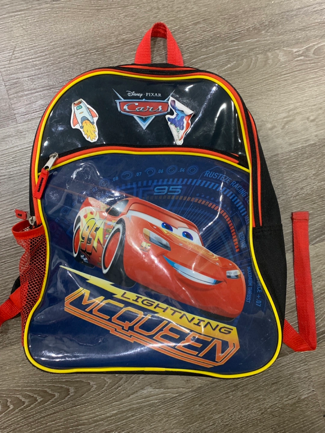 Disney Pixar Cars backpack with Lightning McQueen design. Features a mesh side pocket and a clear front pocket.