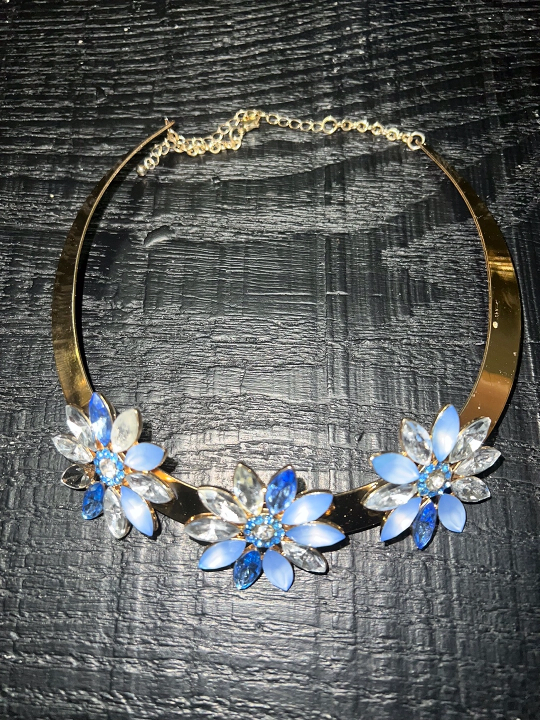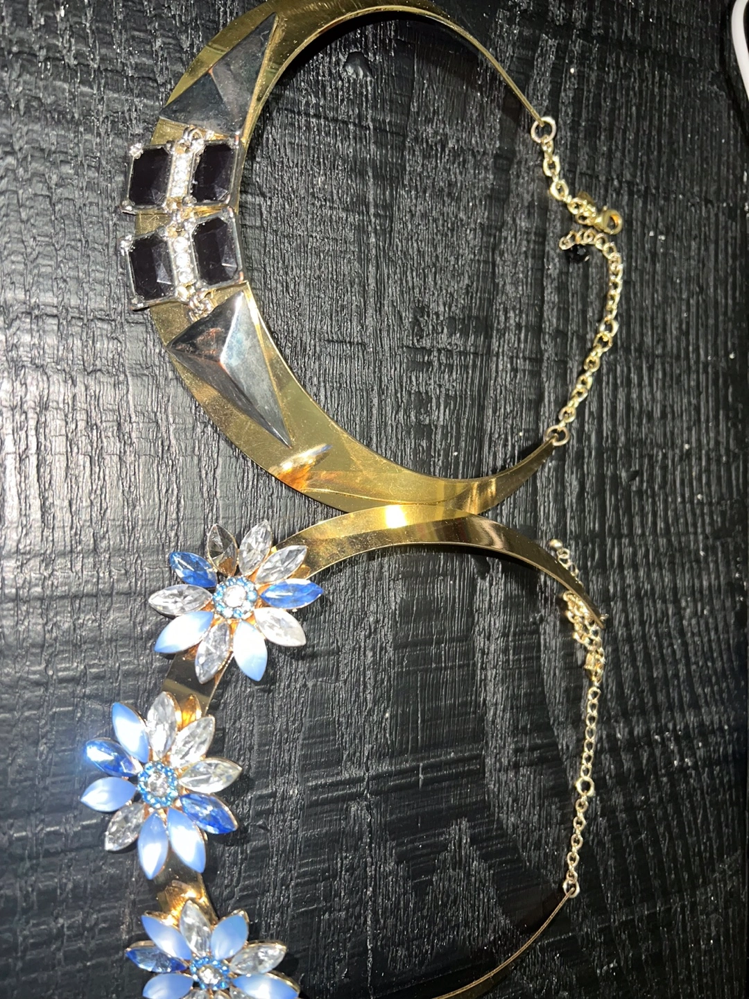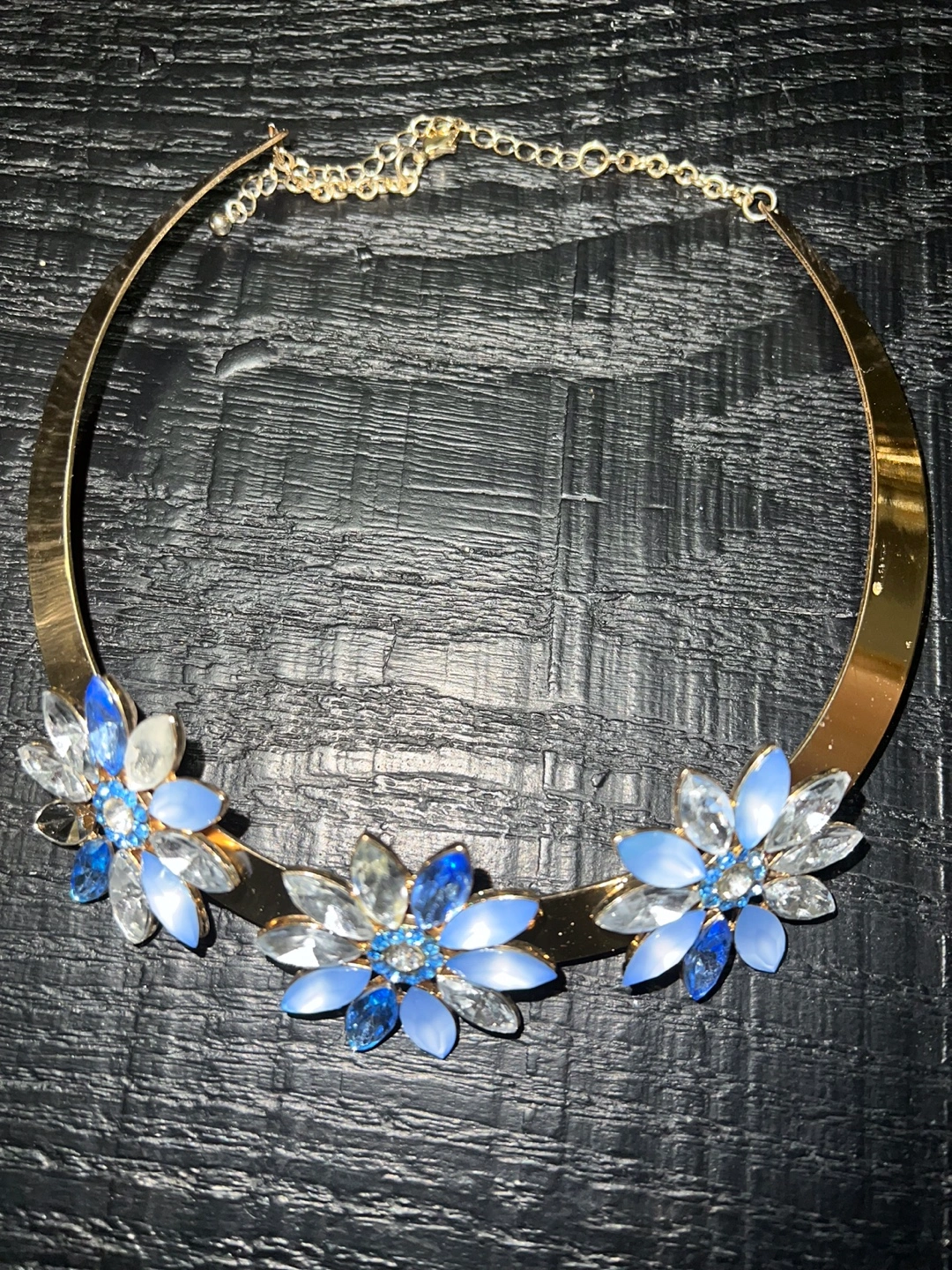 Set of two gold chokers with blue and clear crystal embellishments. One has geometric embellishments, and the other has flower embellishments.