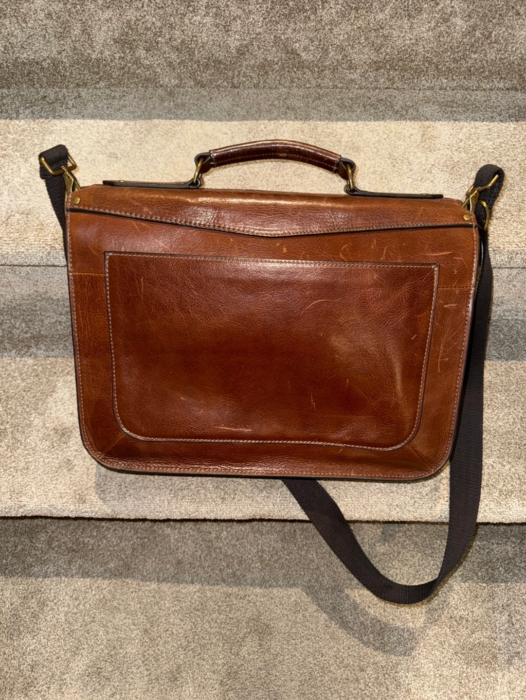 Brown leather briefcase with adjustable shoulder strap. Has multiple pockets and compartments. In good condition.