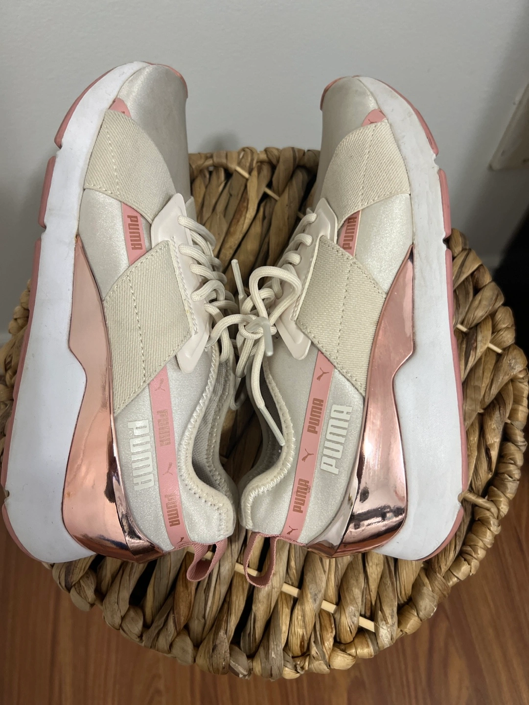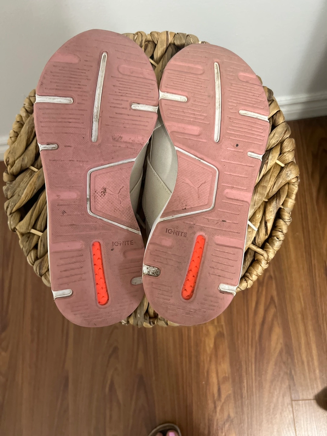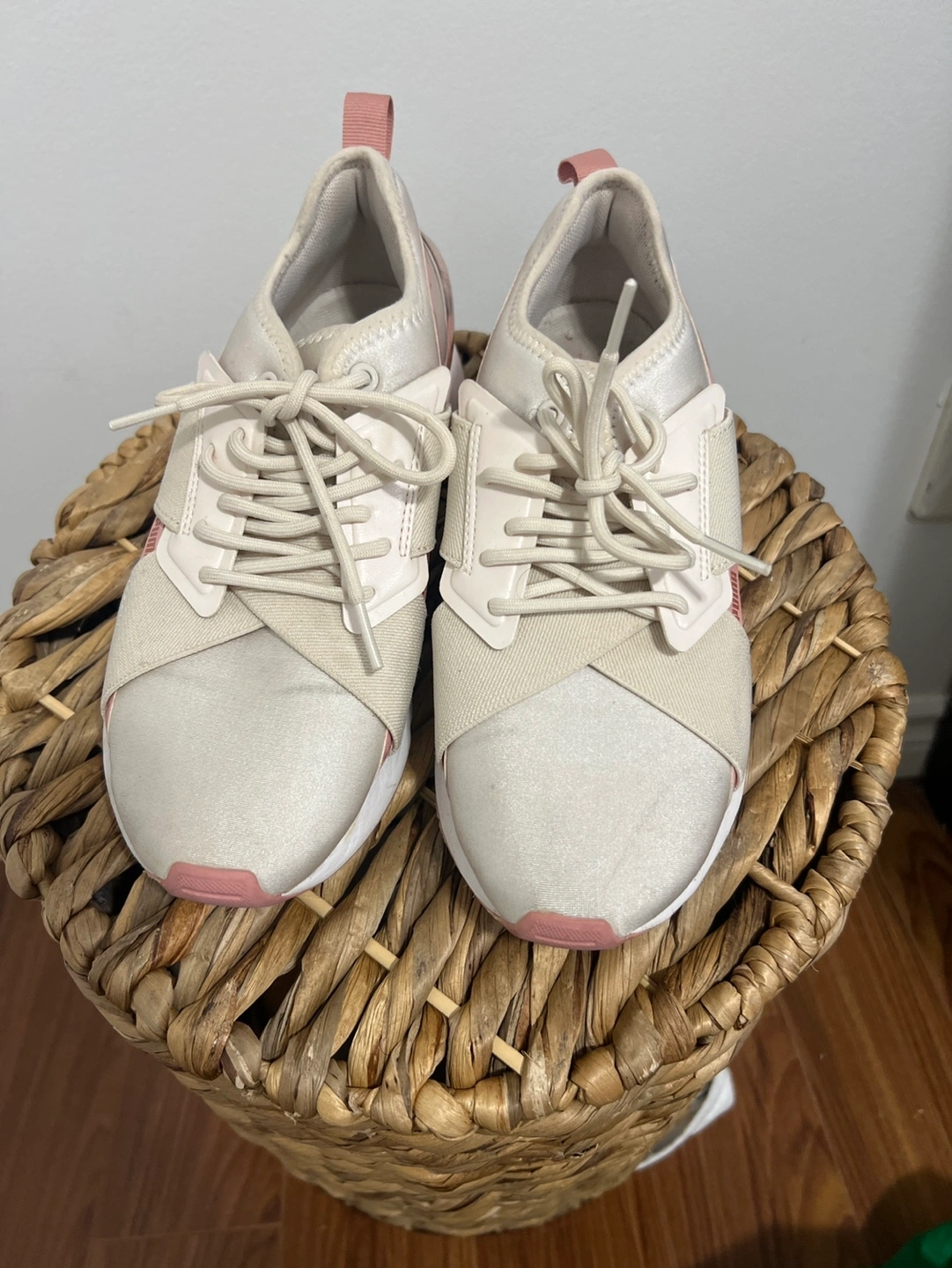 96White and pink running shoes. Lace-up style. Some wear on the sole.