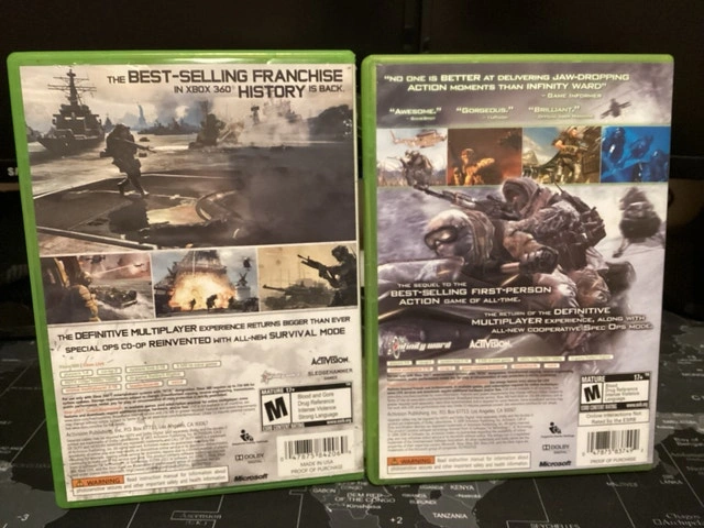 Selling two used Call of Duty games for the Xbox 360: Modern Warfare 2 and Modern Warfare 3. Both games are in good condition and ready for some action-packed gameplay. Grab them now for some nostalgic gaming fun! If the ad's still up, they're still up for grabs! Cashless payment accepted.