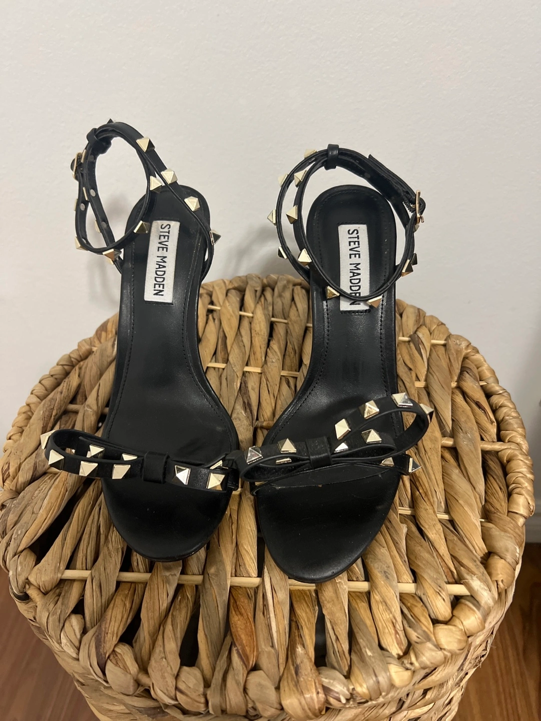 96Black heels with gold studs. Ankle strap with buckle closure. Lightly worn.