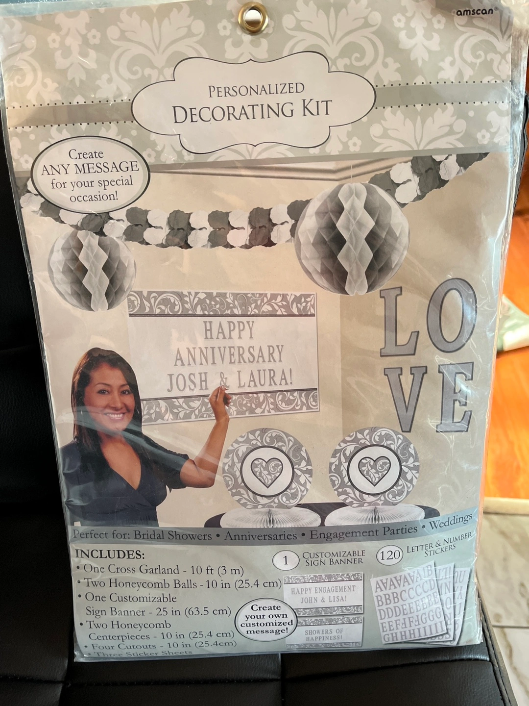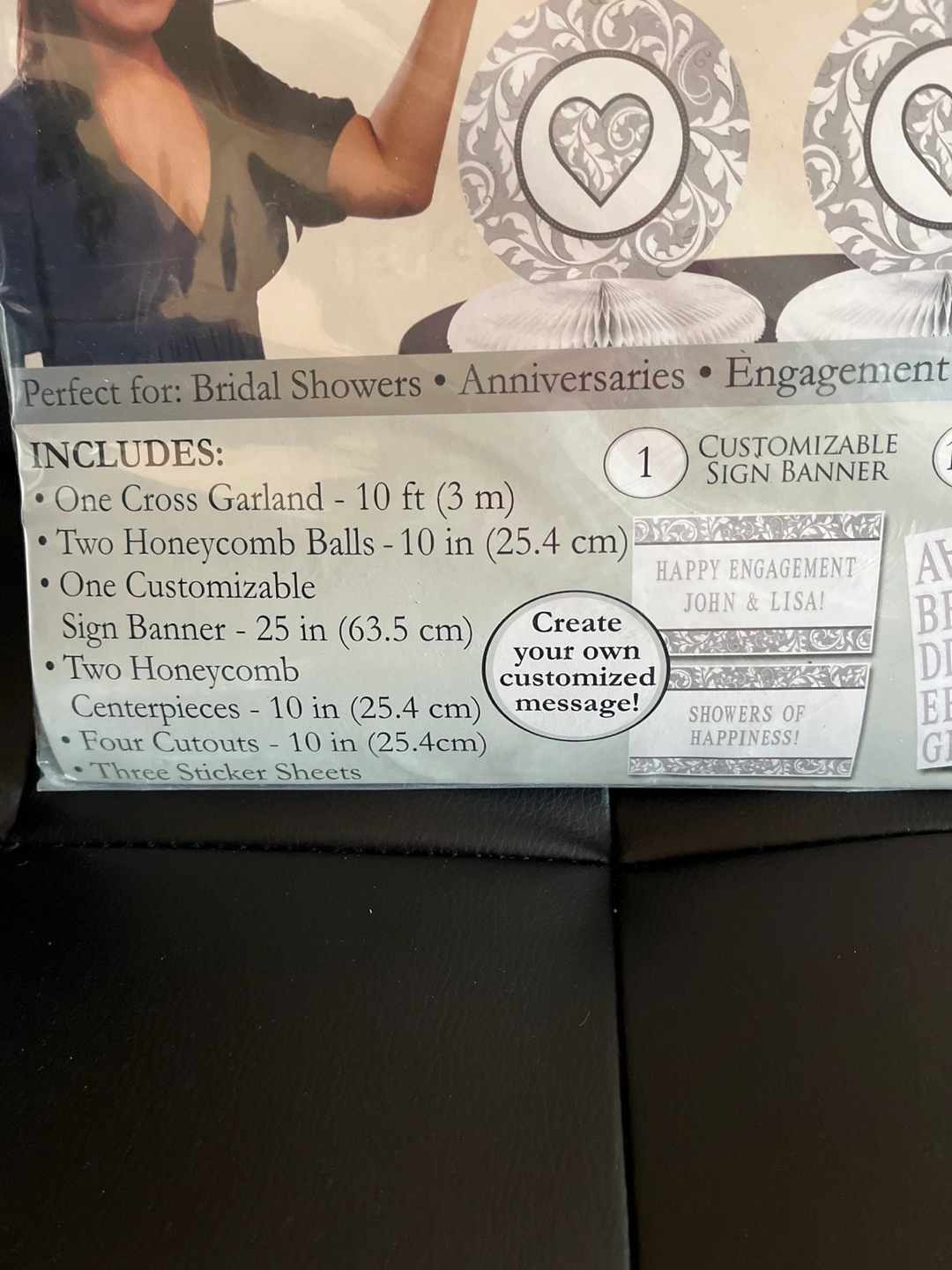 Decorating kit for bridal showers, anniversaries, engagements and weddings. Includes a cross garland, honeycomb balls, sign banner, honeycomb centrepieces, cutouts, and sticker sheets. Customizable sign banner and letter stickers for personalized messages.