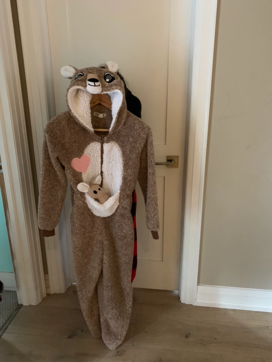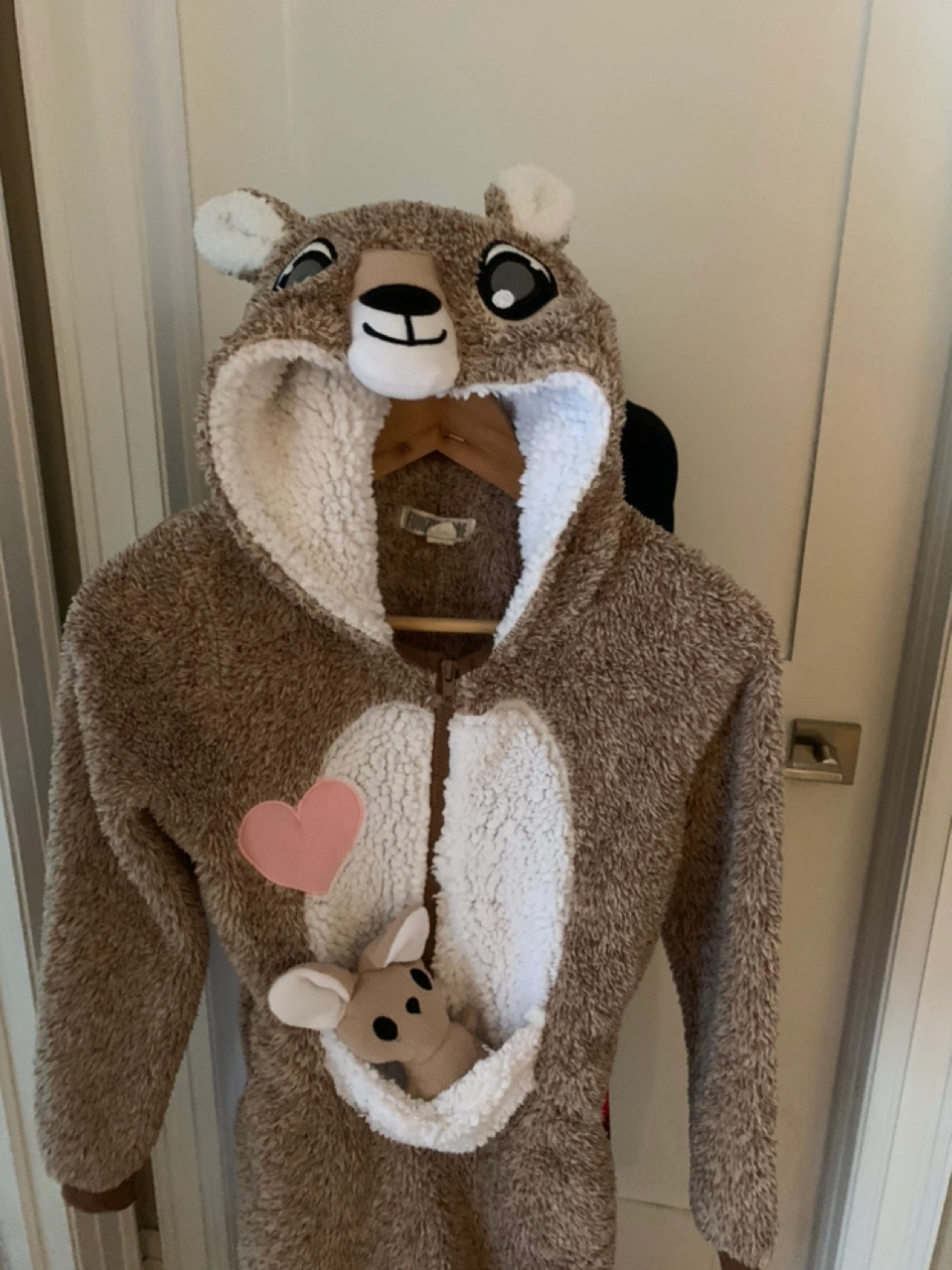 104Kids/Tweens kangaroo onesie. Fuzzy and soft with a cute kangaroo pouch and joey. Perfect for lounging around the house, or to use as Halloween costume. Size 14-16