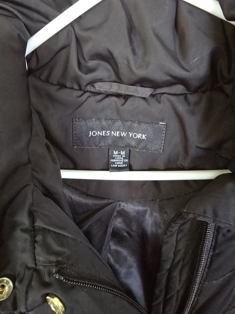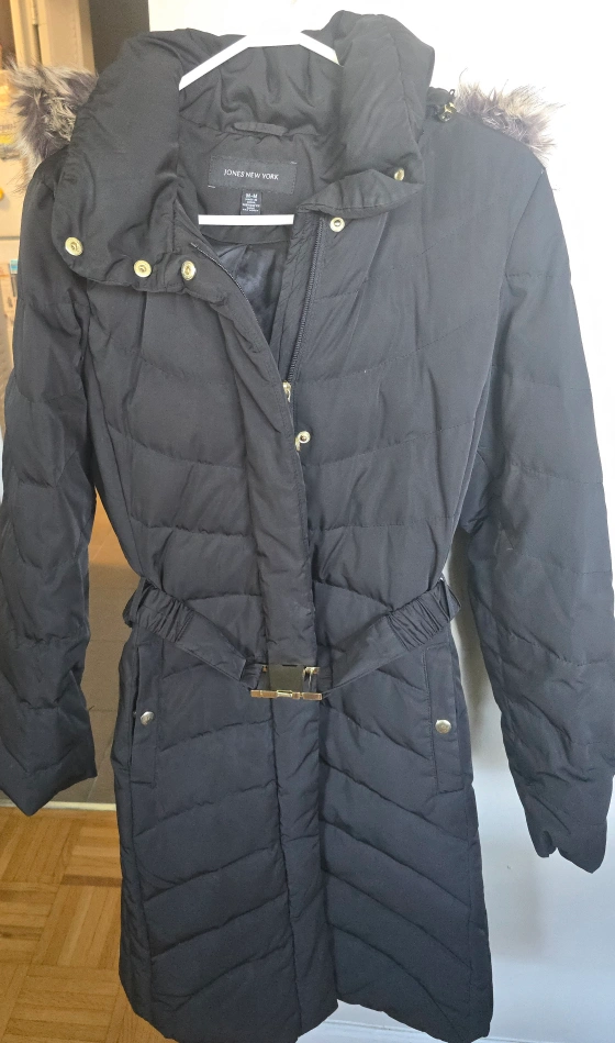 Black long winter coat with fur trim on the hood. The coat has a belt, pockets, and a zipper closure.