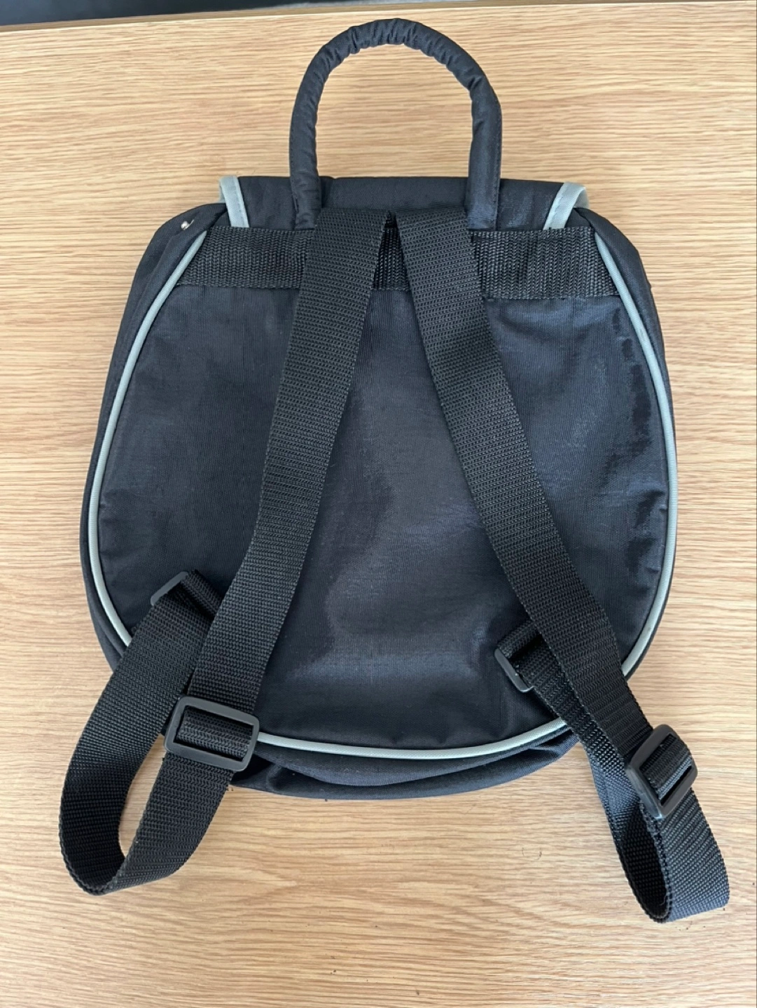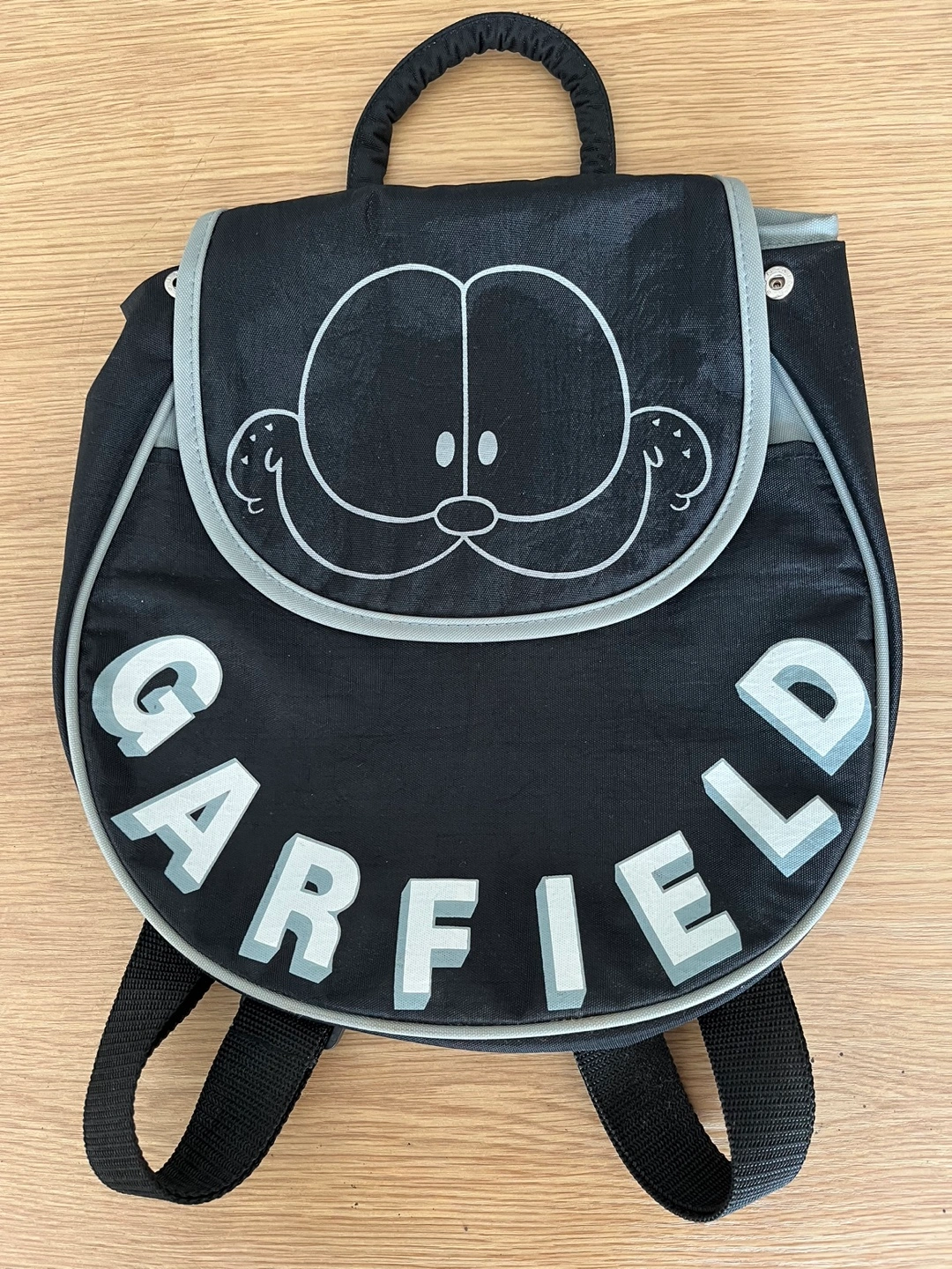 New backpack with a grey Garfield design. Features an adjustable strap and a handle on the top. There are pockets on the inside. Never used before. If ad is up, the backpack is available!