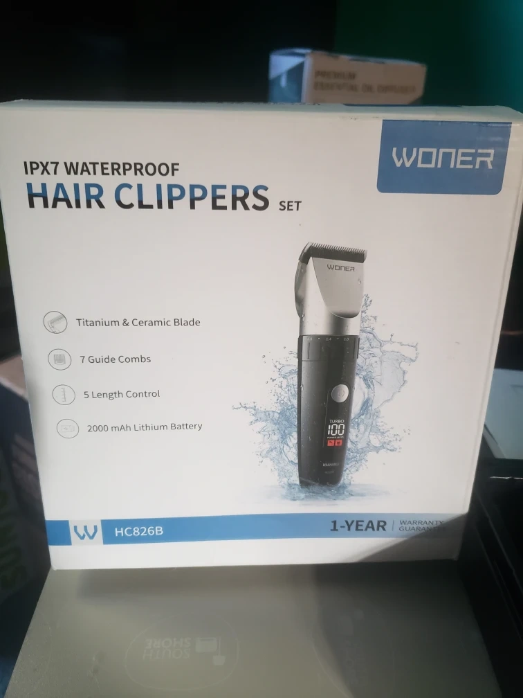 Waterproof hair clippers with titanium and ceramic blade. Includes 7 guide combs, 5 length controls, and a 2000 mAh lithium battery.