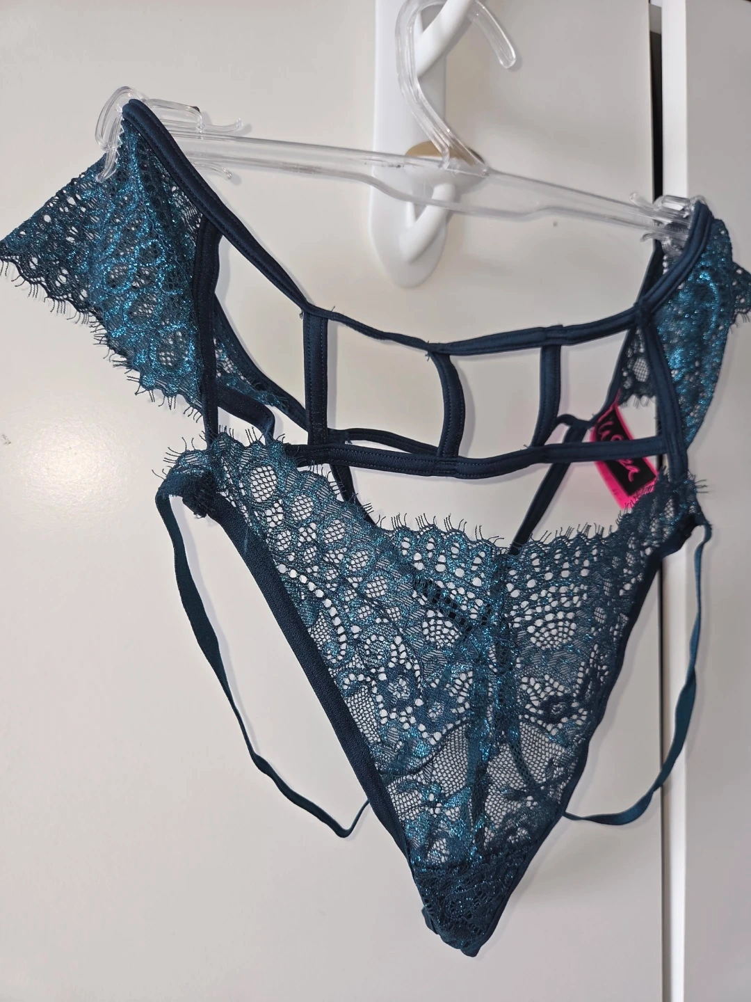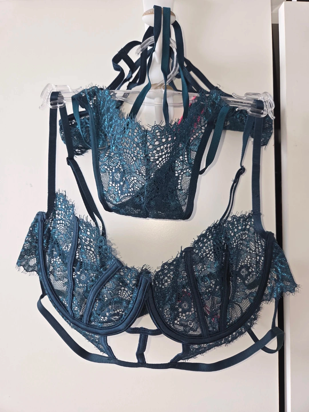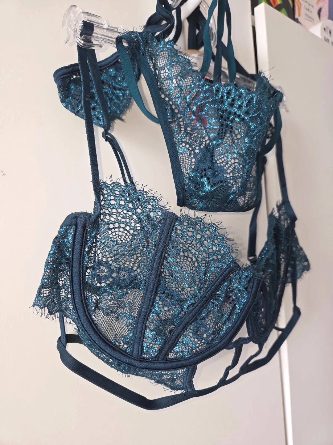 Beautiful teal lace lingerie set, includes a bra and matching panty. Features intricate lace detailing and a strappy design. Perfect for a special occasion!