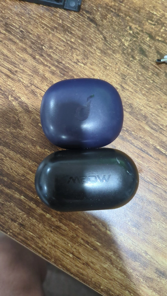 Two pairs of wireless earbuds and their charging cases. One pair is dark purple, the other black.