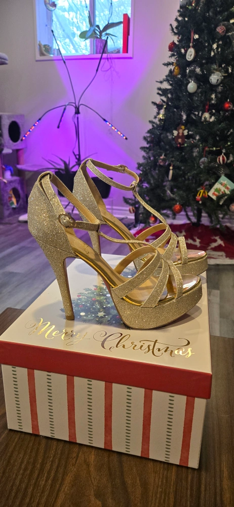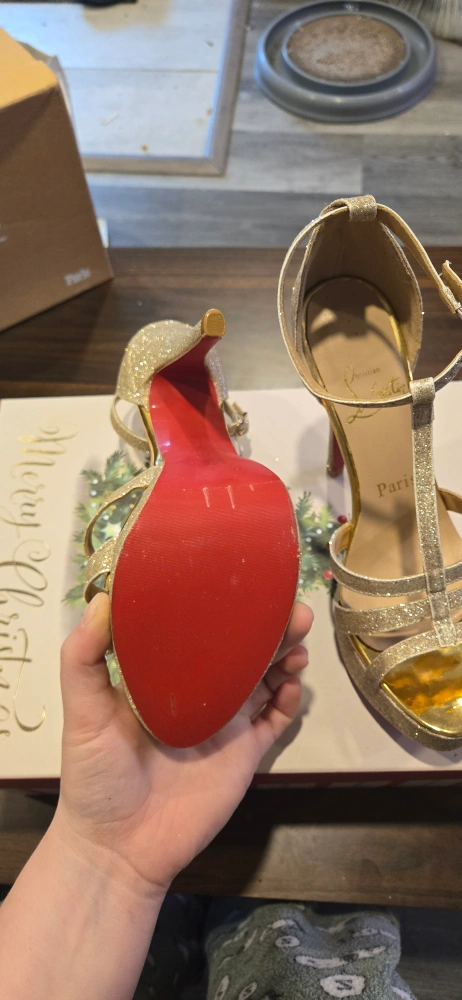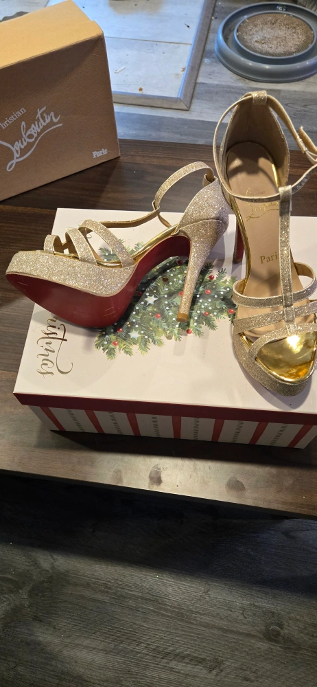 Selling a pair of Christian Louboutin heels in gold glitter . These stylish heels come with the original box. Perfect for a night out or special occasion! Never used because they are too big.
