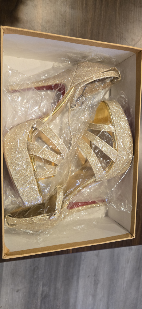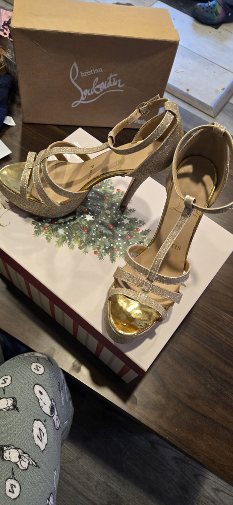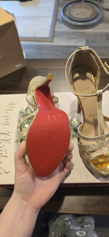 Selling a pair of Christian Louboutin heels in gold glitter . These stylish heels come with the original box. Perfect for a night out or special occasion! Never used because they are too big.