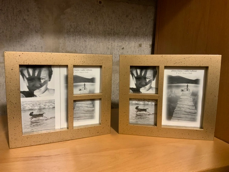 Only 2 pictured but have a set of 4 gold picture frames. Each frame has space for 3 pictures. Can also be hung on the wall.