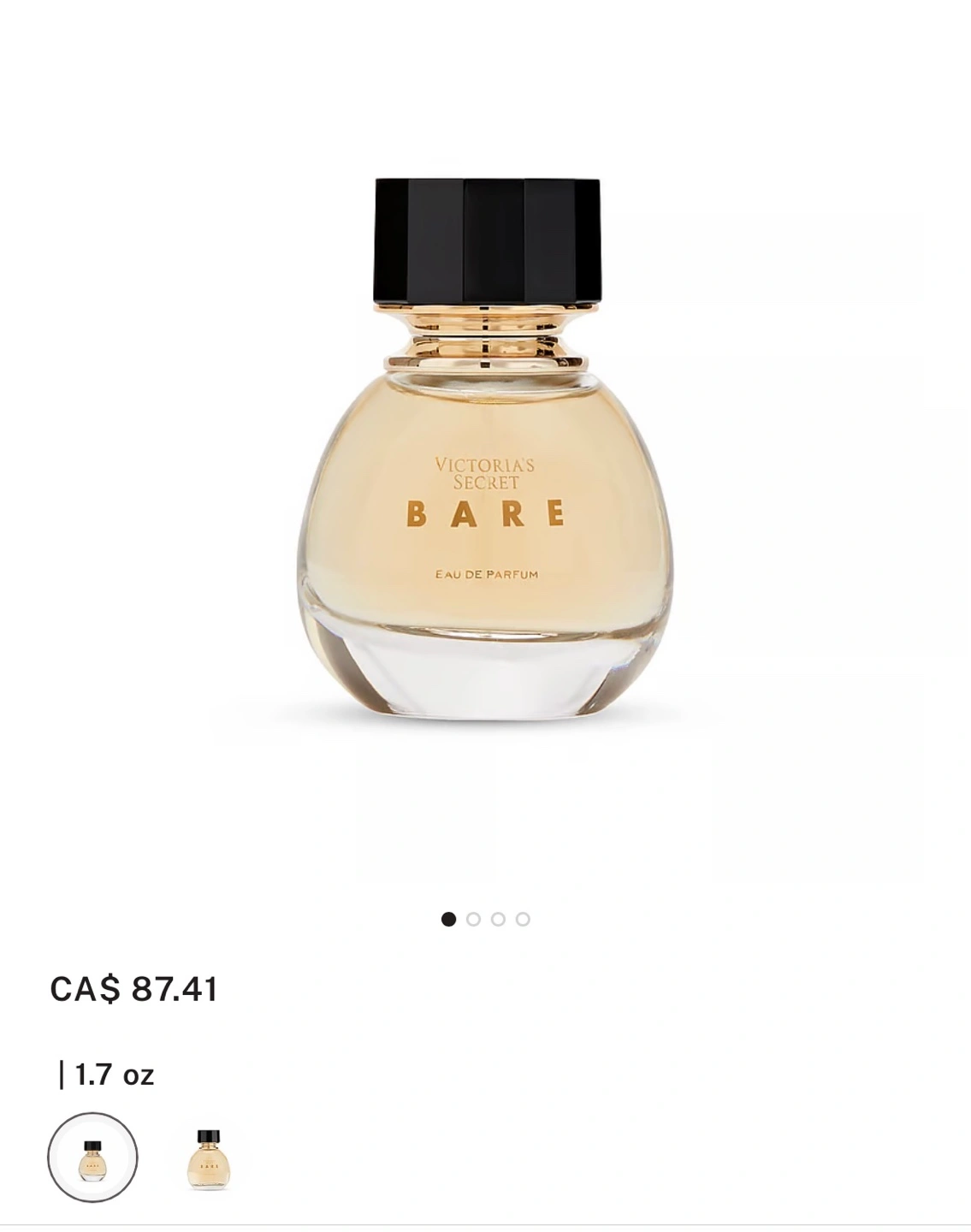 1.7 oz bottle of Victoria's Secret Bare Eau de Parfum. Notes include Egyptian Violet Petals, Upcycled Australian Sandalwood, Mandarin Madagascar.