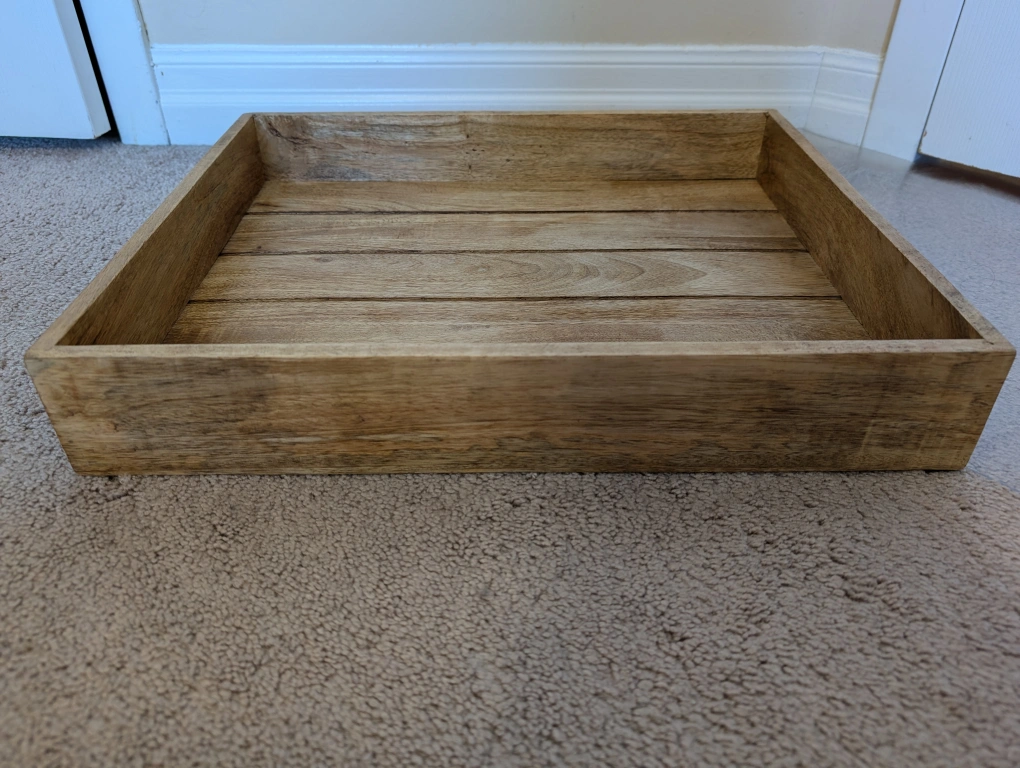 Rectangular wooden tray with black metal handles. Perfect for serving or organizing.