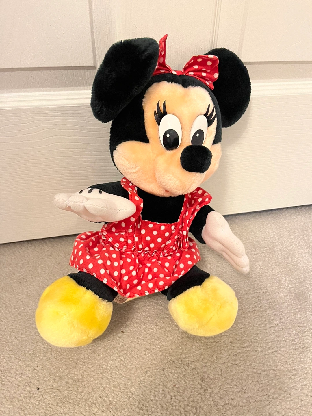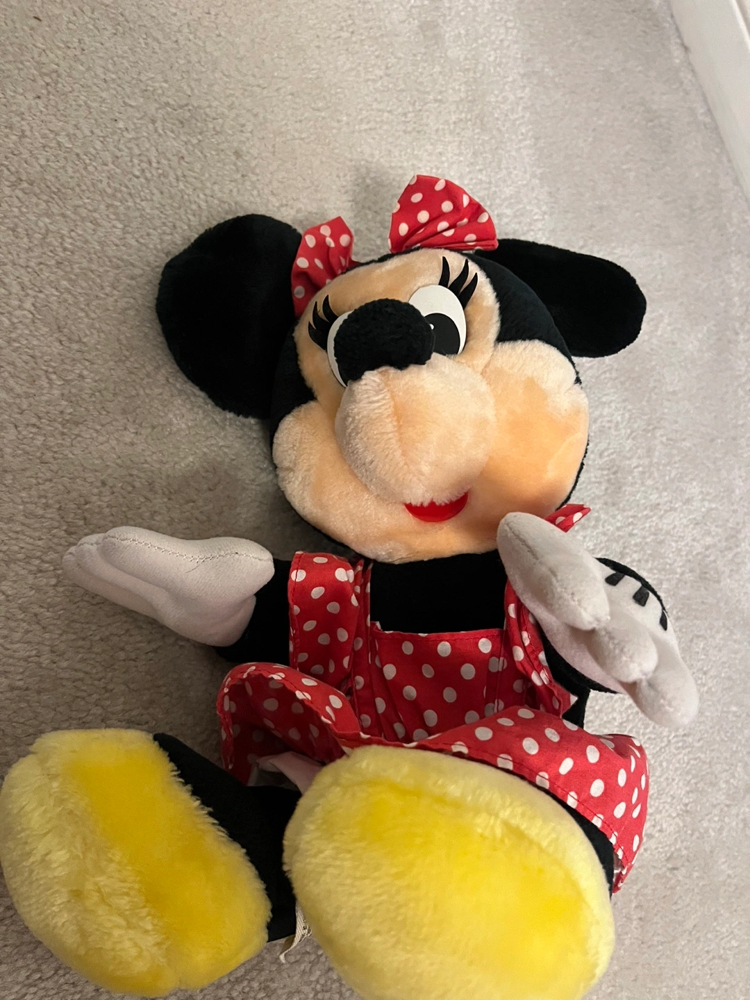 404Vintage Minnie Mouse plush toy. Red dress with white polka dots and yellow shoes.