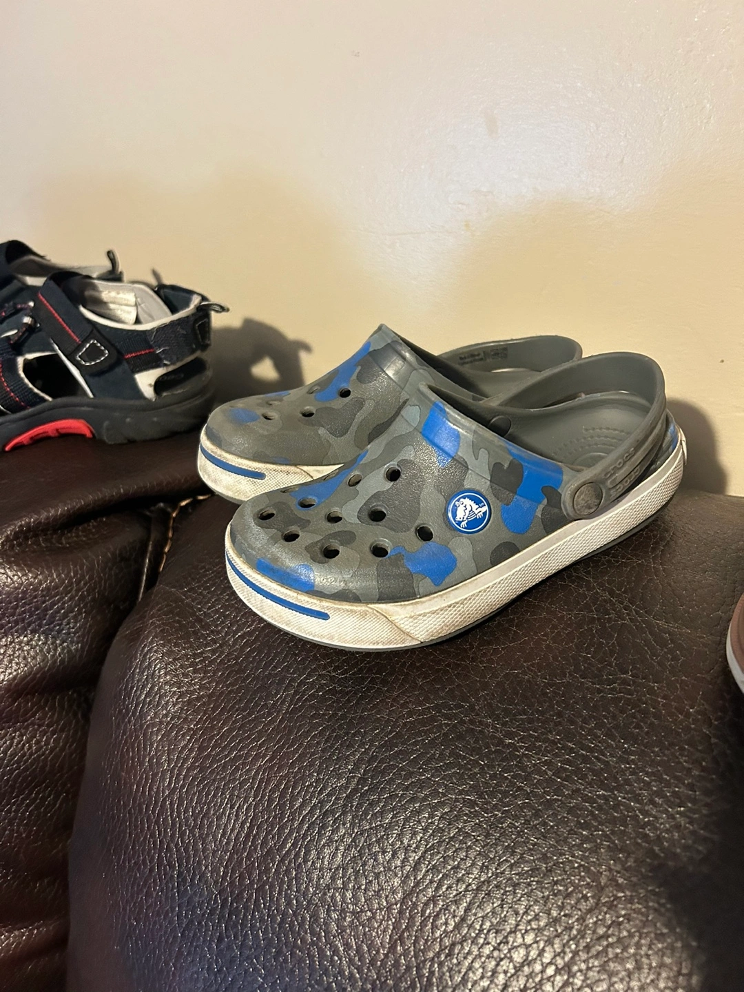 Bundle includes a red and black plaid jacket, a red Spiderman puffer jacket, a red toque and mittens set with a beaver design, and a pair of white, green, and black running shoes. All items are in good condition.