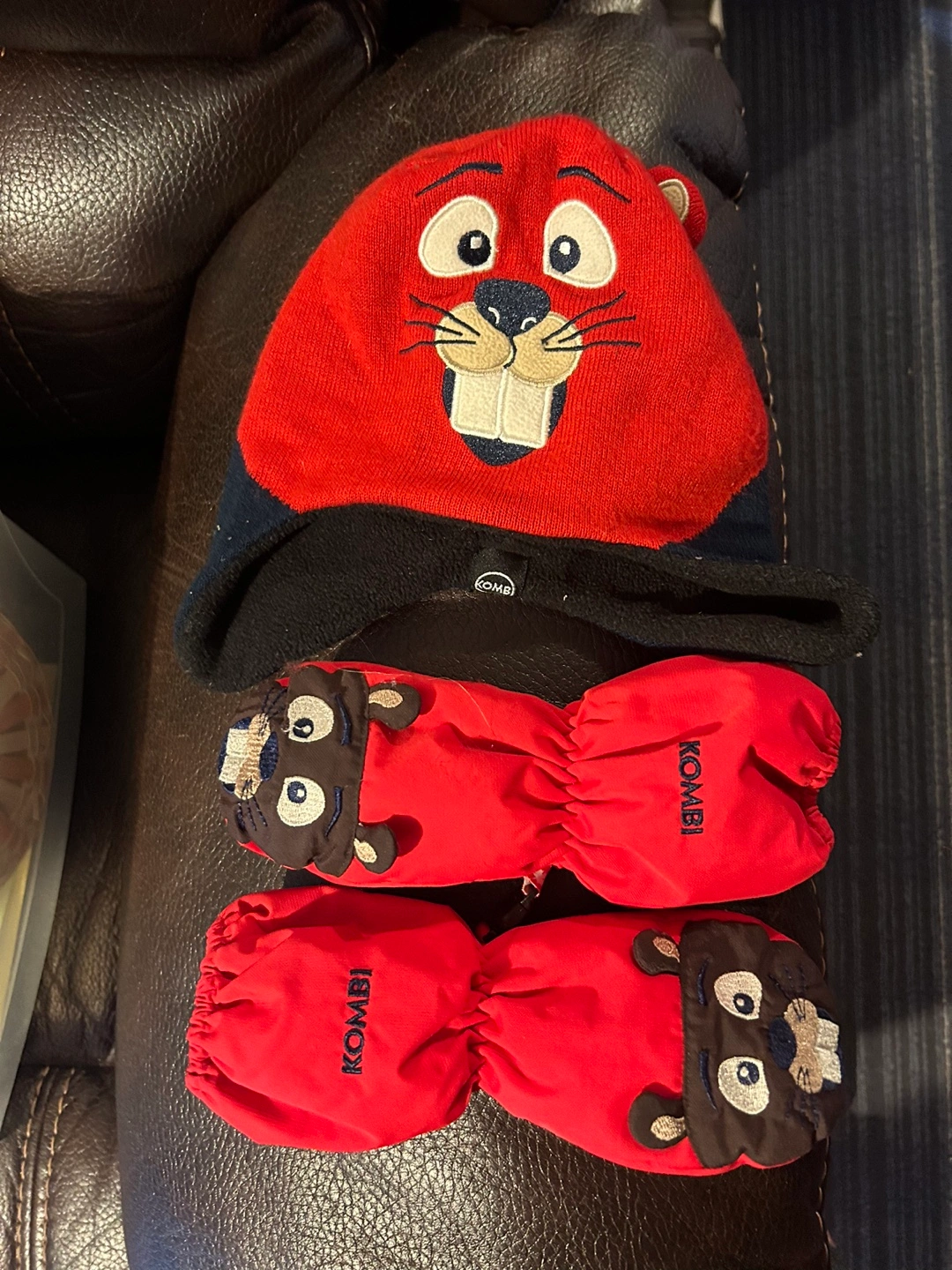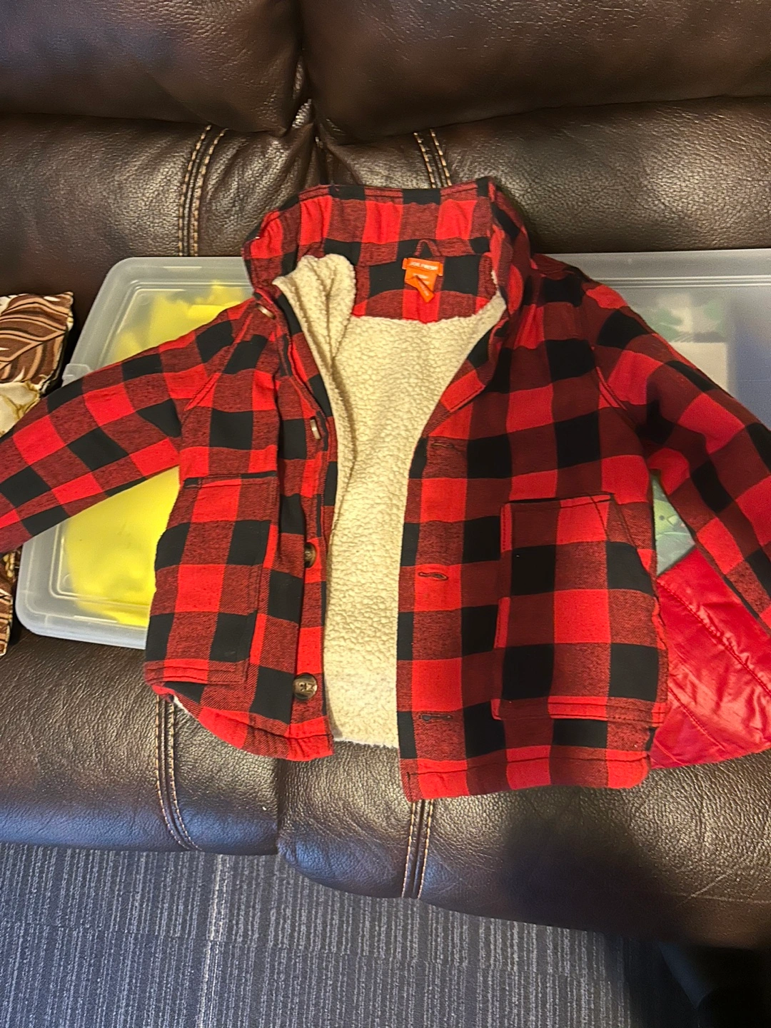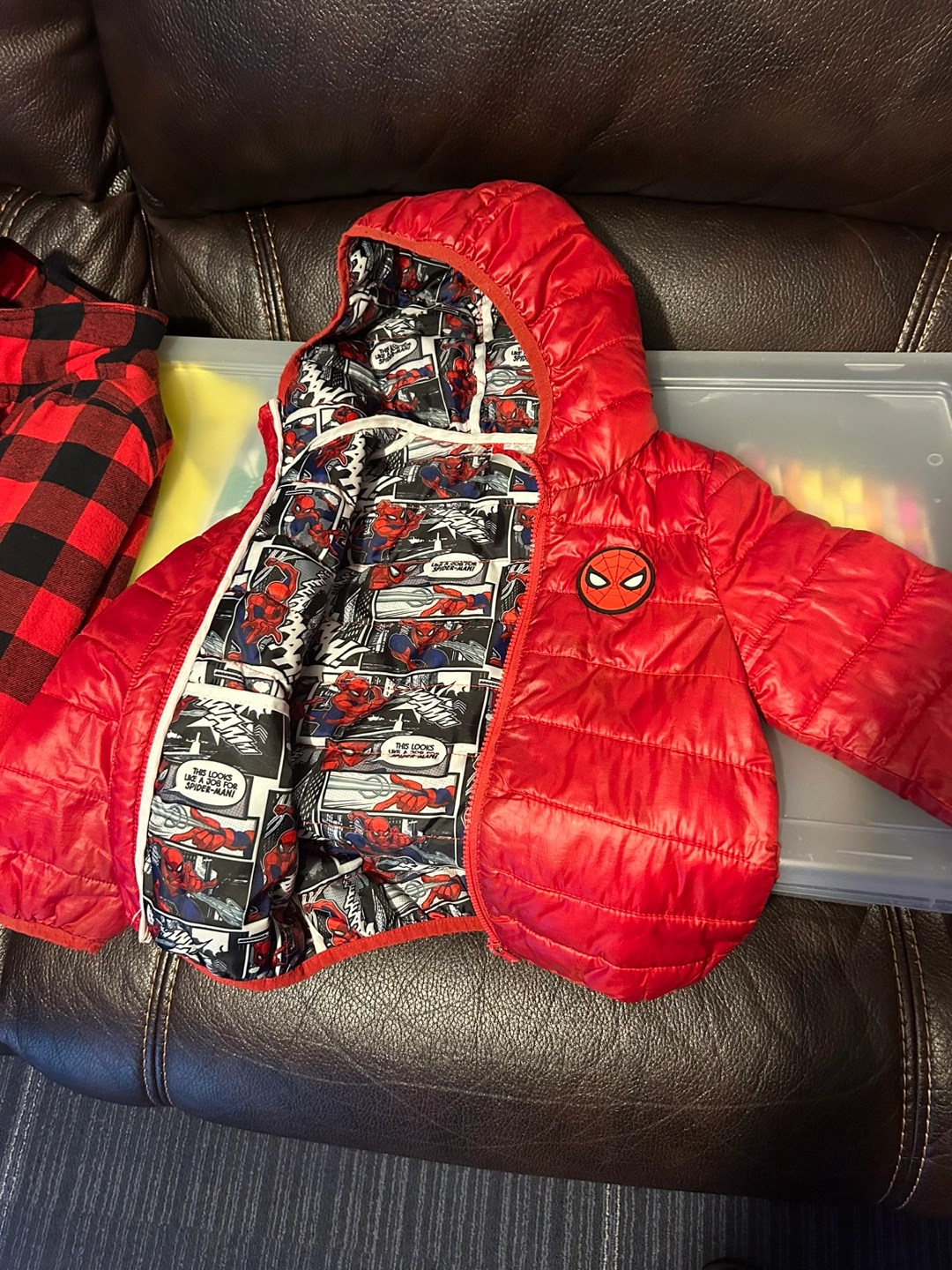 Bundle includes a red and black plaid jacket, a red Spiderman puffer jacket, a red toque and mittens set with a beaver design, and a pair of white, green, and black running shoes. All items are in good condition.