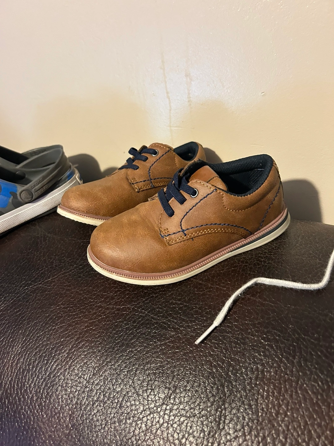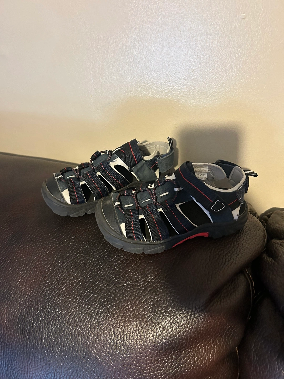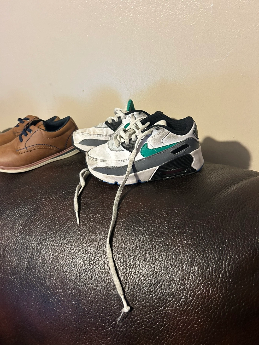 Bundle includes a red and black plaid jacket, a red Spiderman puffer jacket, a red toque and mittens set with a beaver design, and a pair of white, green, and black running shoes. All items are in good condition.