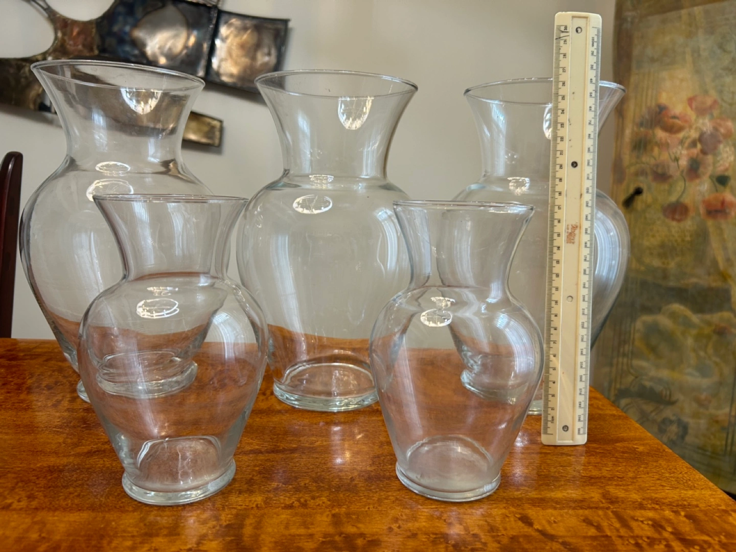 Attention Wedding DYI , home stagers and Florists Set of 18 glass vases. Includes a frosted pink vase, a clear cylinder vase, a tall red vase with a LOVE charm, a clear vase with a rounded base and a blue swirl vase. Must bring your own boxes and tissue to transport vases securely.