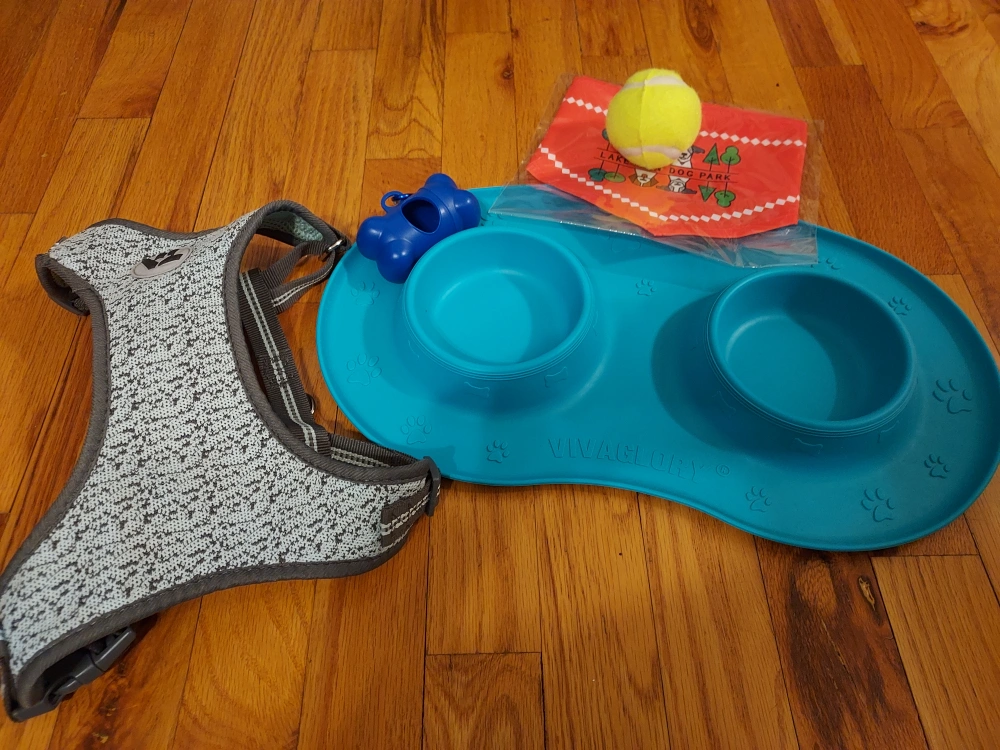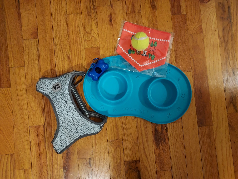 105Dog harness (medium)with a matching bowl set. Includes a dog toy and bandana. Only used the dog bowl a couple of times, it's all washed. Everything else is new! Pick up- Thorndale and Kenmore