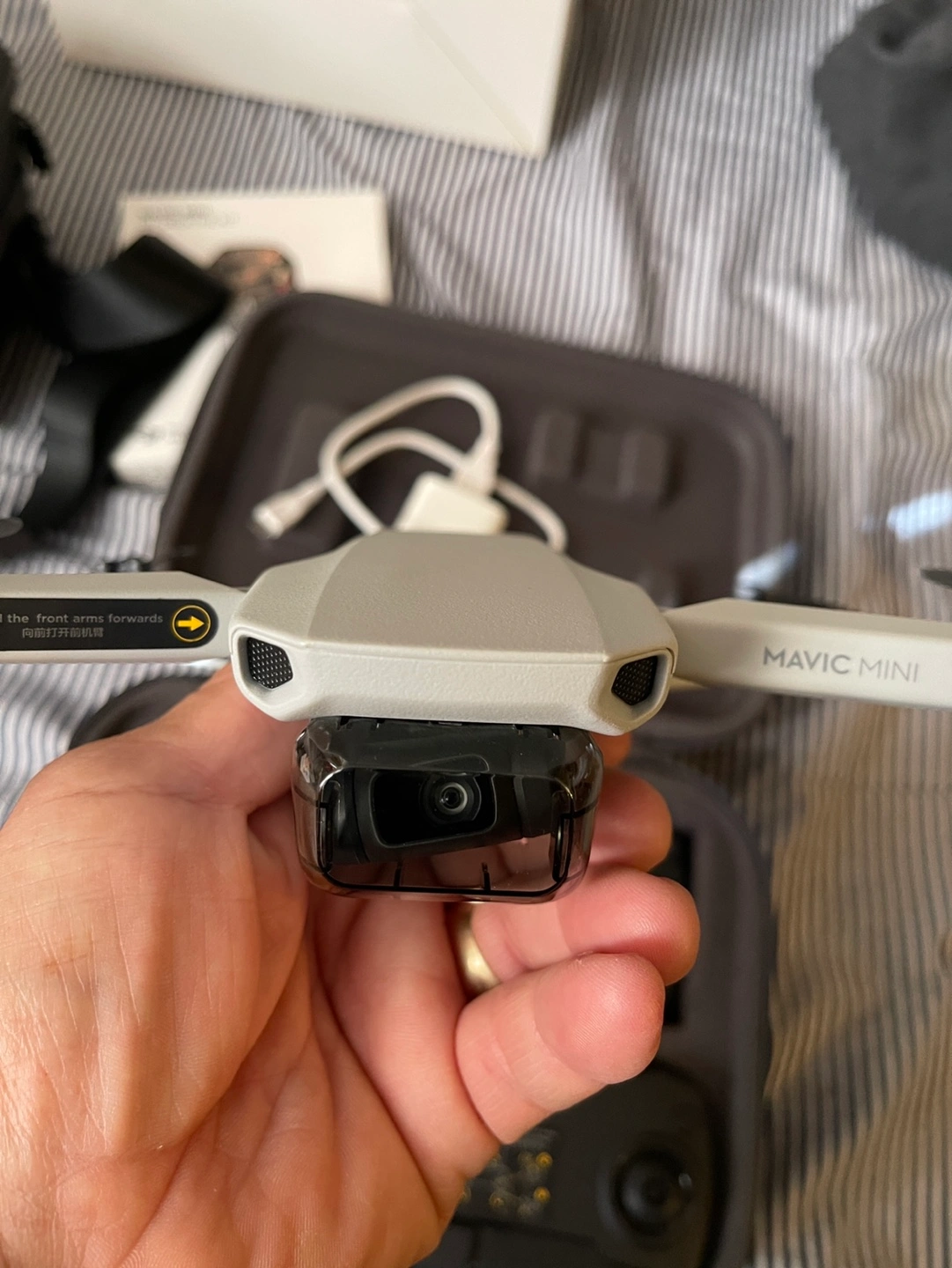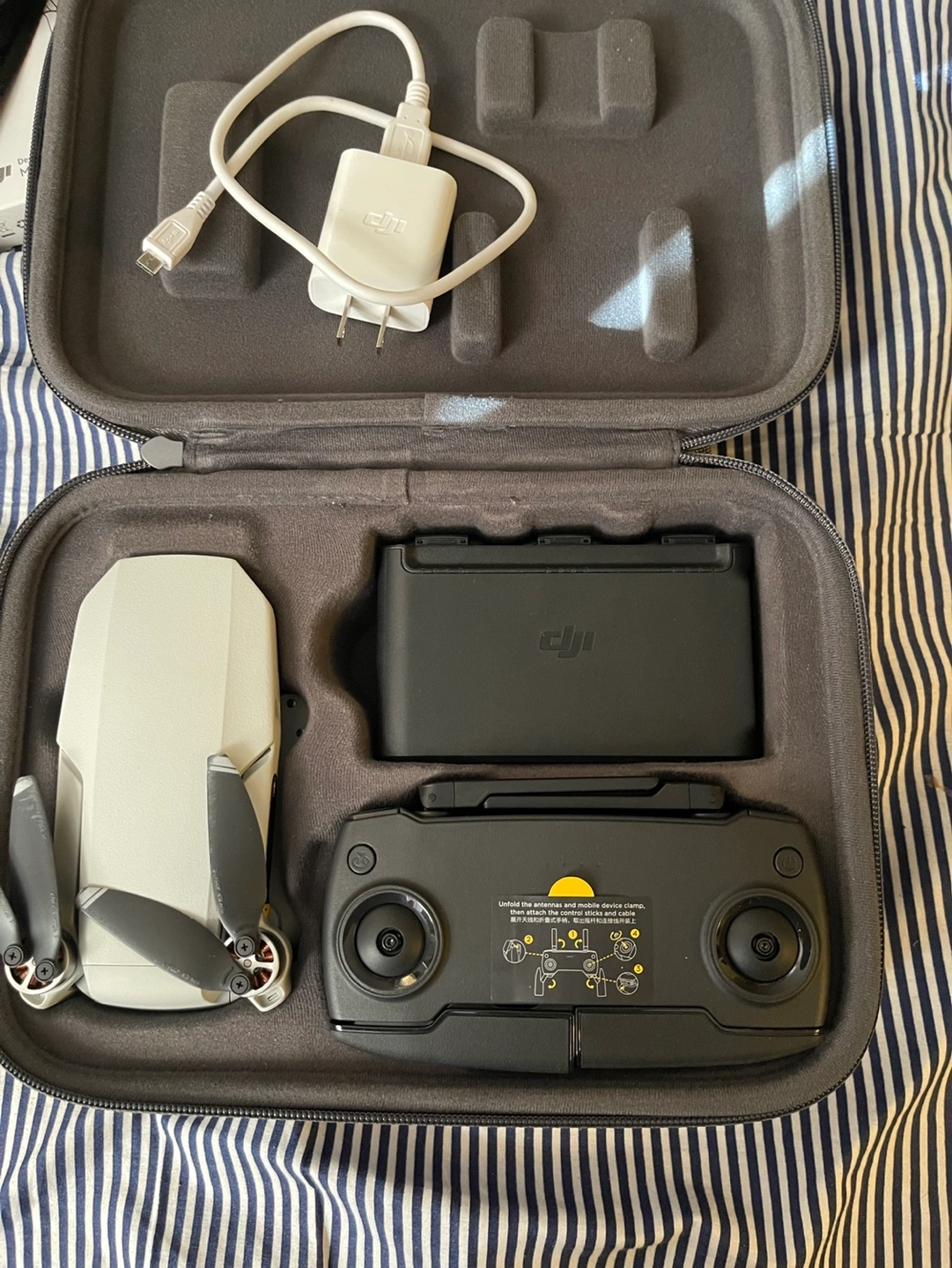 DJI Mavic Mini drone with carrying case, landing pad, and extra accessories. This is the FlyMore Combo which includes extras of everything. Extra batteries, extra propellors, etc. Has charger and all cables. Also included is custom DJI shoulder bag made just for this drone, and a pop-out portable landing pad. This can be used anywhere so the drone does not get dirty or damaged landing on the ground.