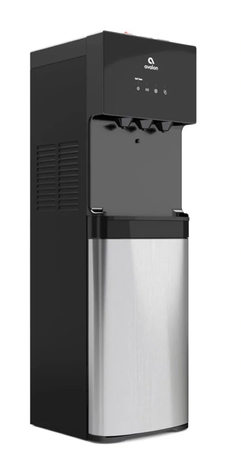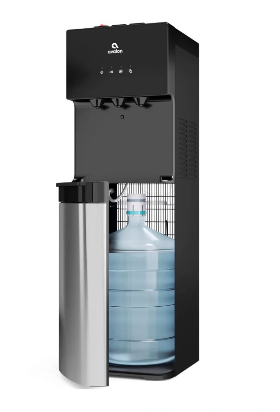 Black water cooler with stainless steel base. Has hot, cold, and room temperature settings. Great for hot water on demand! Bottom load.