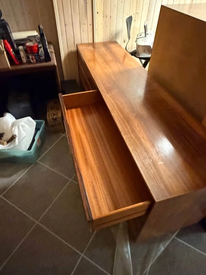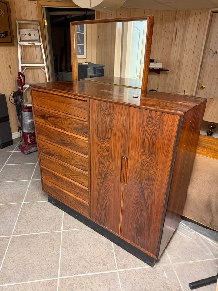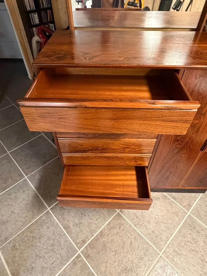 Late 1960s era solid Rosewood bedroom furniture. Scandinavian design, known for using the highest grade rosewood. Brazilian rosewood was banned in 1969, so these are likely from before that time. No visible markings, as they were often faint from manufacturers of that era. This set has been in my family since I was a child.
