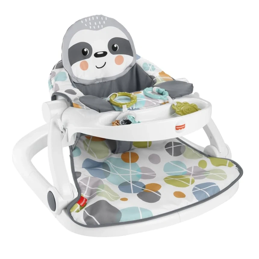 Fisher-Price Sit-Me-Up floor seat with sloth design and attached toys. It's great for tummy time and helping baby learn to sit up. Removable tray included. Attached toys not included.