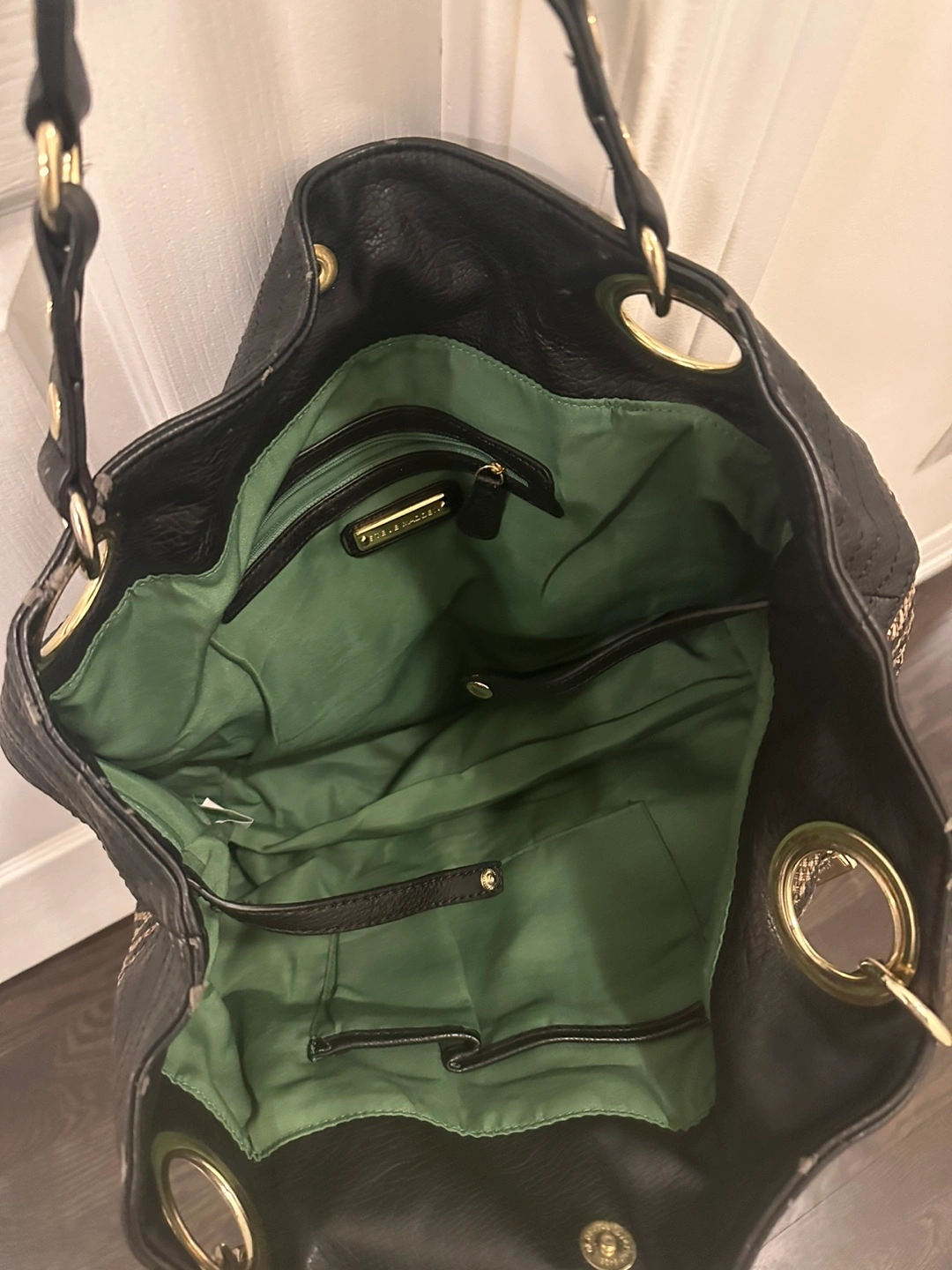 Black tote bag with tan zebra print on one side. Gold hardware. Inside features green fabric lining and multiple pockets.