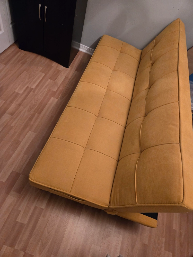 Yellow tufted a sofa bed with wooden legs. Folds out into a bed. Non-smoker home. Moving out sale.