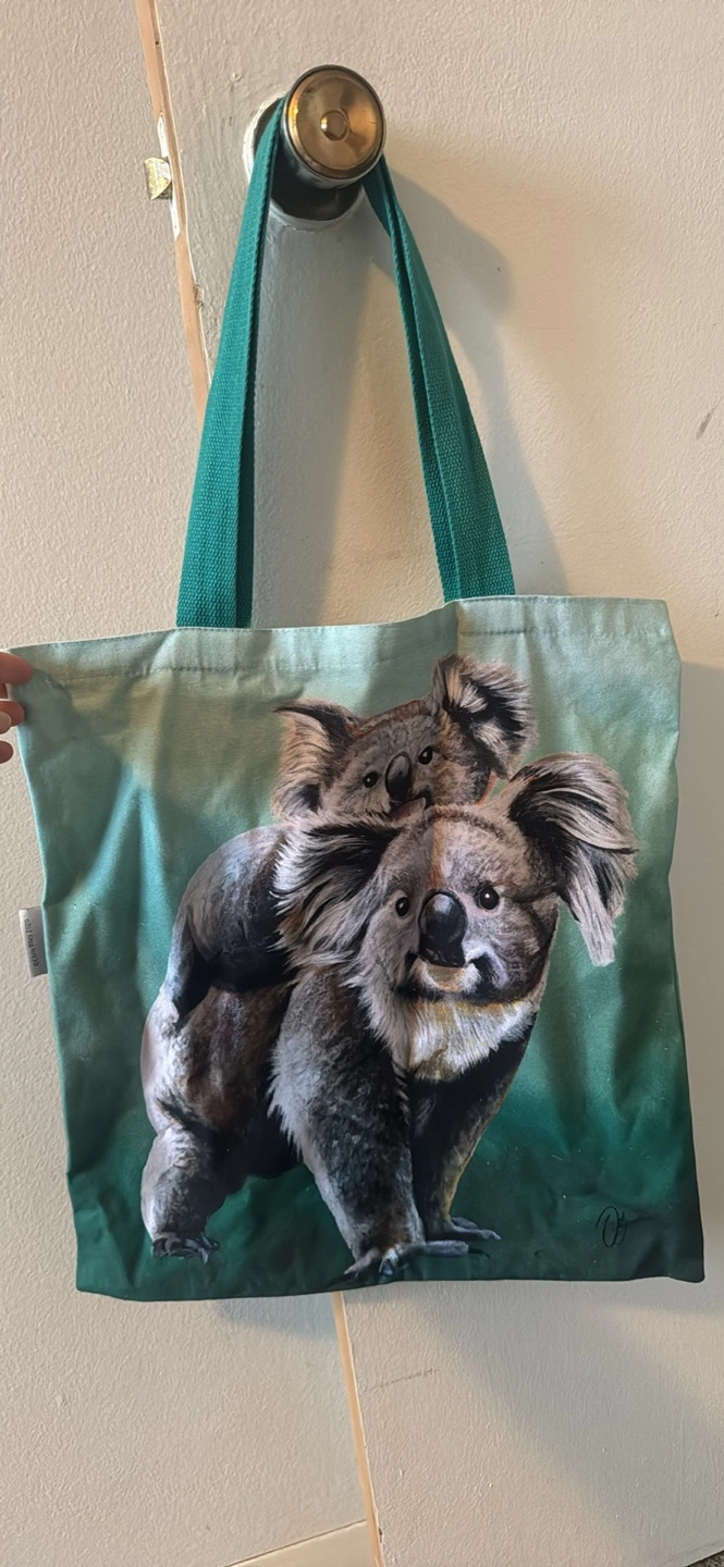 26Green tote bag with a koala design. The bag has two green handles. Pick up in Westend