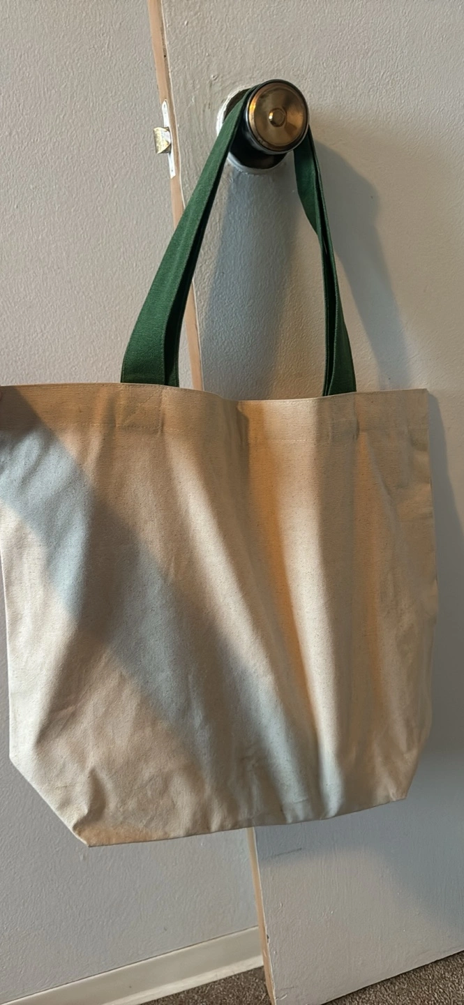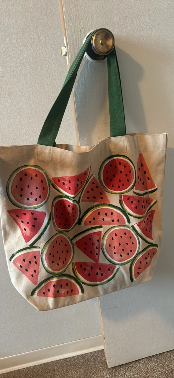 26Canvas tote bag with green handles and a watermelon print. Great for shopping, carrying books, or everyday use. Pick up in Westend