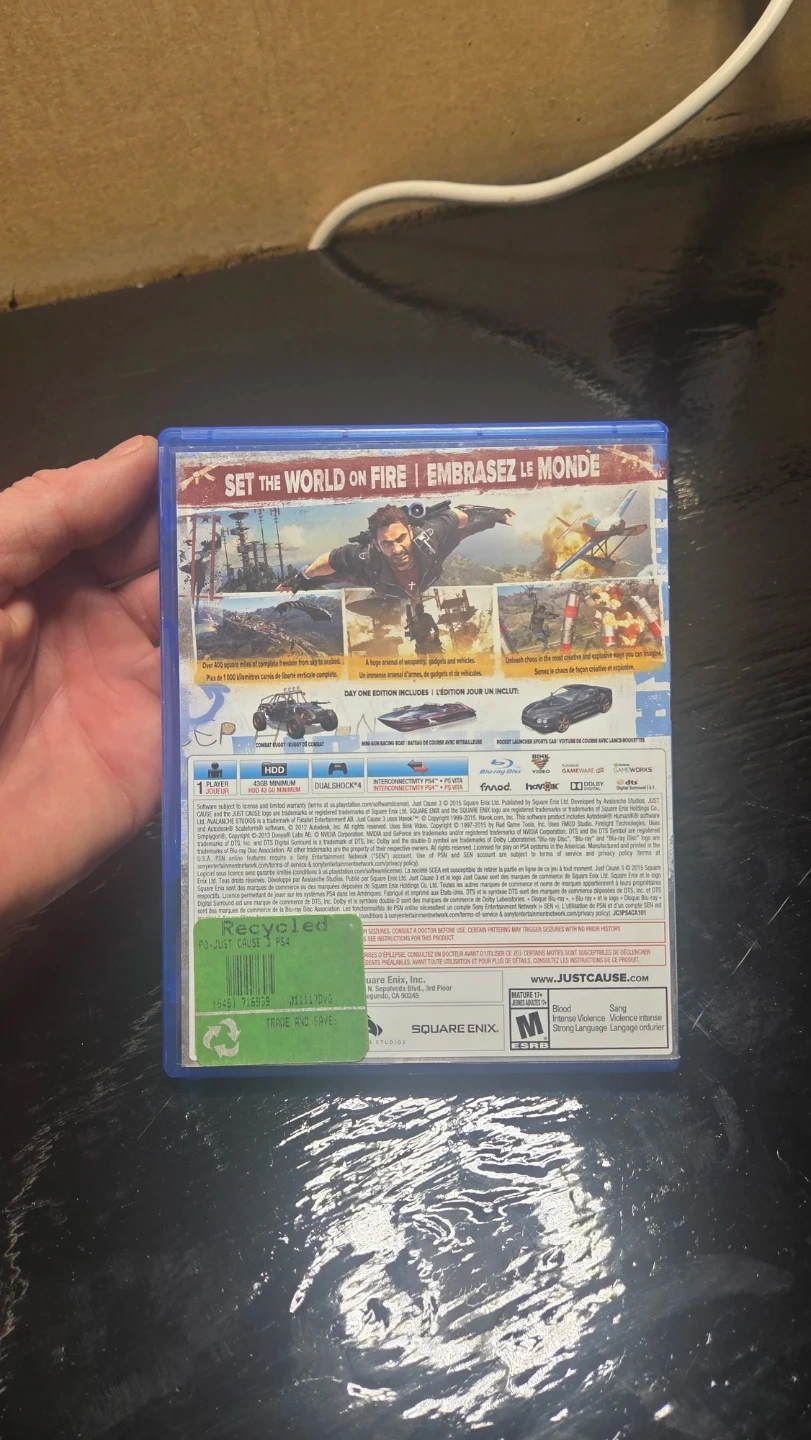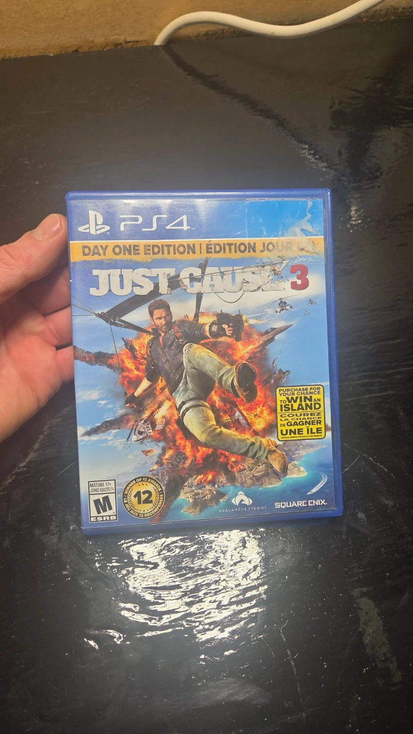 This is the Just Cause 3 Day One Edition for PlayStation 4. It includes the game disc and case. A registration code is also present inside.