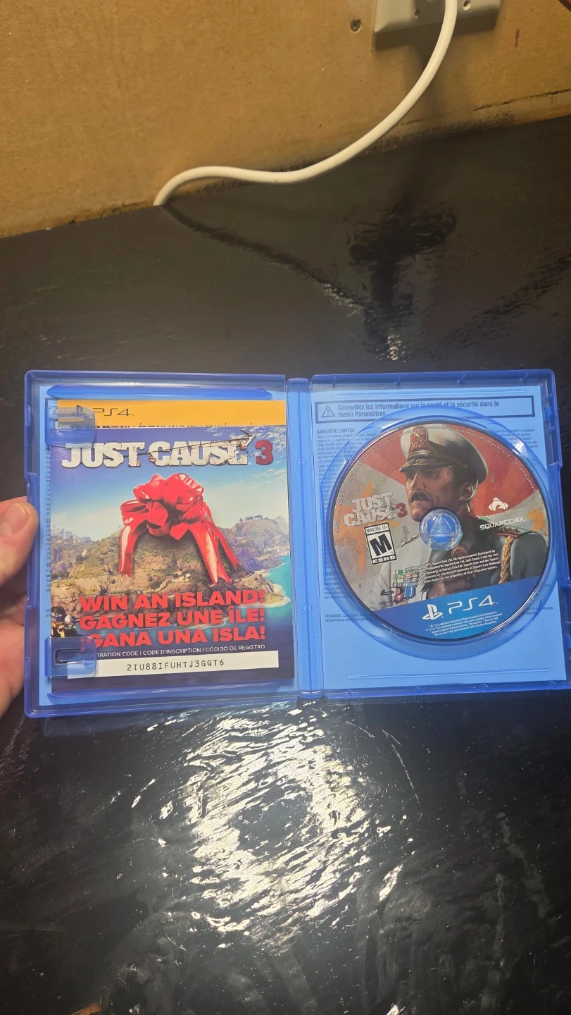 This is the Just Cause 3 Day One Edition for PlayStation 4. It includes the game disc and case. A registration code is also present inside.